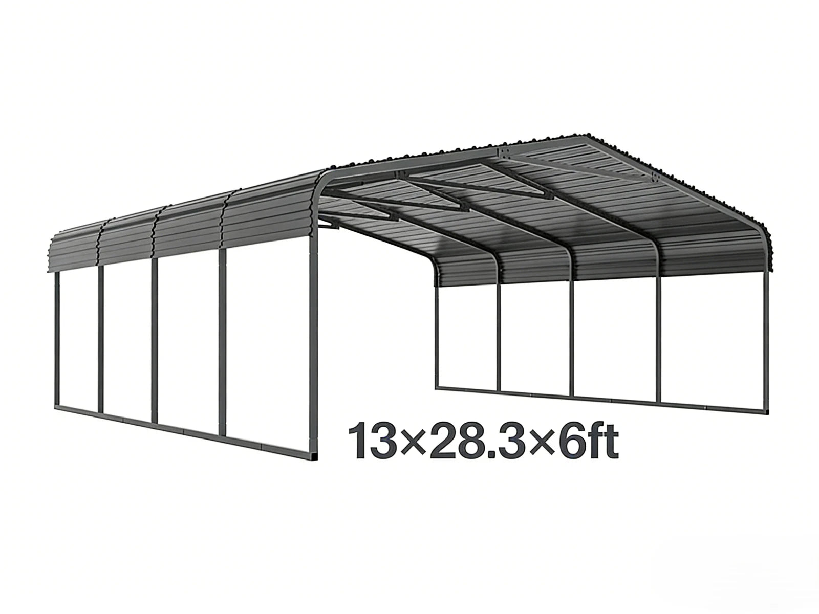 - Fully assembled large steel carport measures 13 ft. wide x 28 ft. deep x 6 ft. high and weighs 485 lbs.