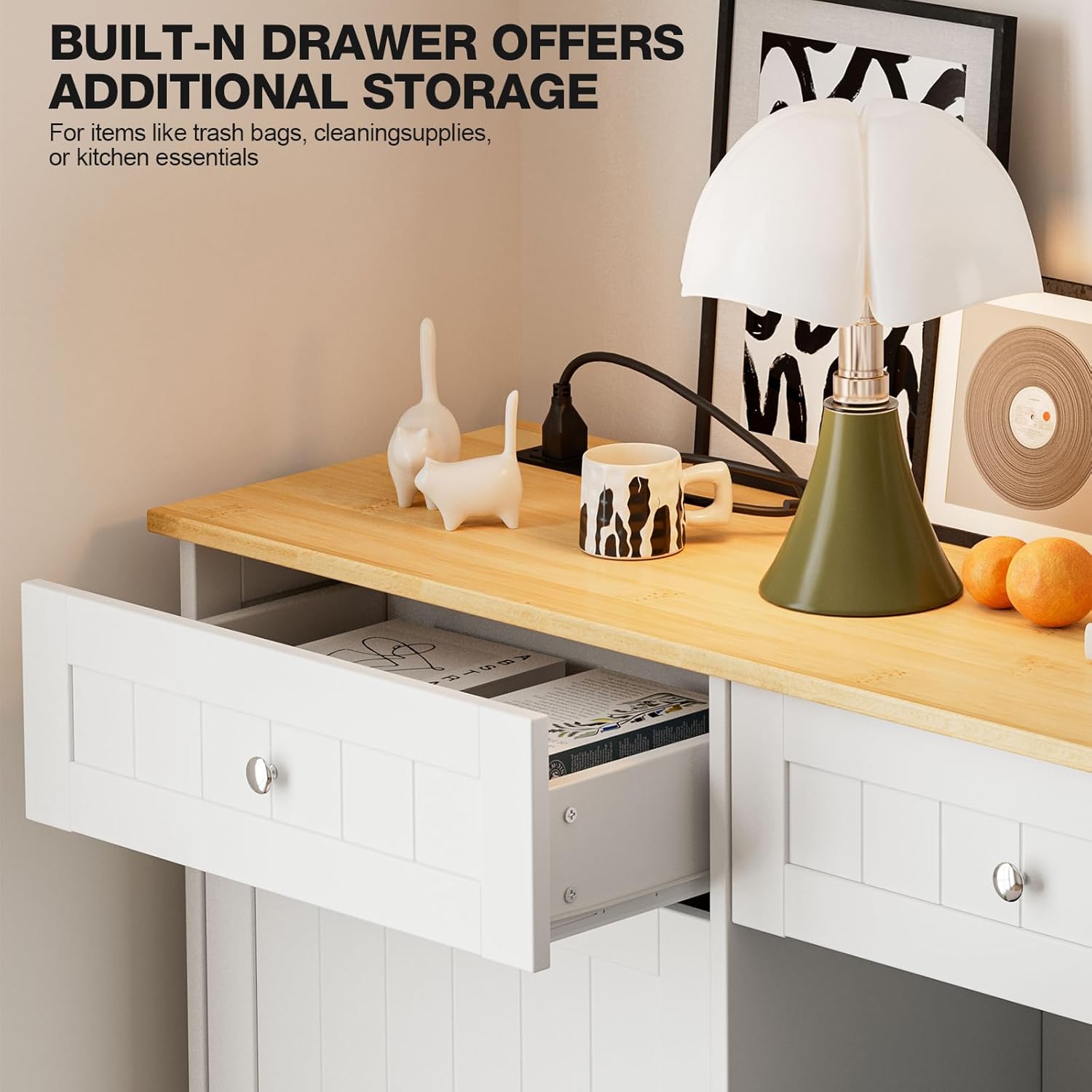 - 【Upgraded trash can cabinets】— Our trash can cabinets have a charging station on the top panel.(Included 2 Standard AC Outlets, 2 USB Ports).So you can easily power your coffee maker,microwave and other electronic devices