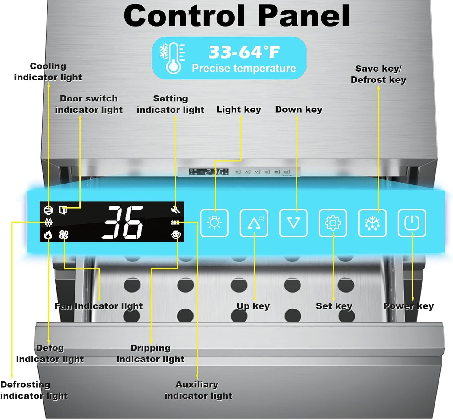 - The high-efficiency cooling system, featuring an upgraded compressor and fan circulation, chills drinks to your desired temperature (36°F-64°F) in just 15 minutes. With whisper-quiet operation below 38 dB and a low-vibration design, it integrates seamlessly into any space without disruption.