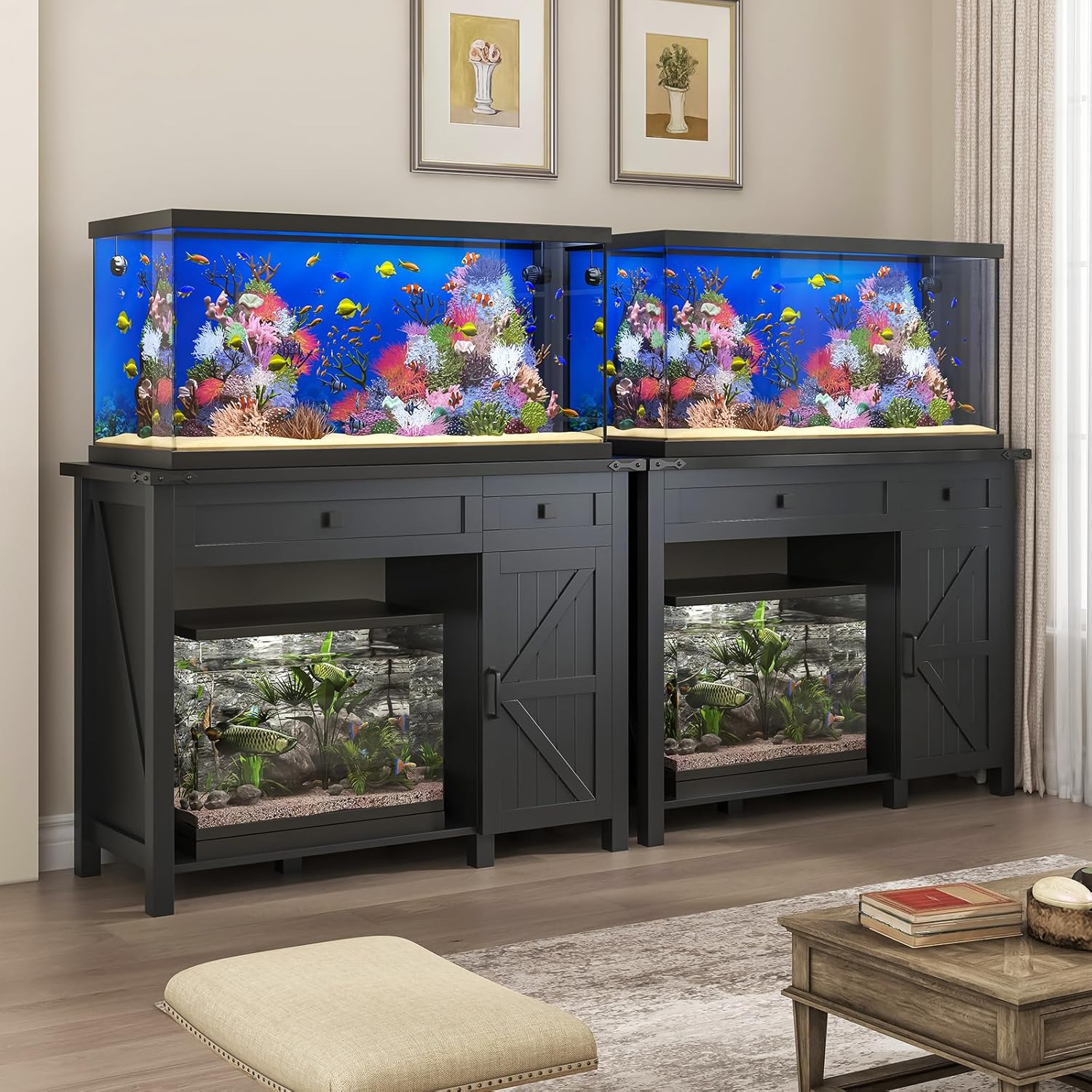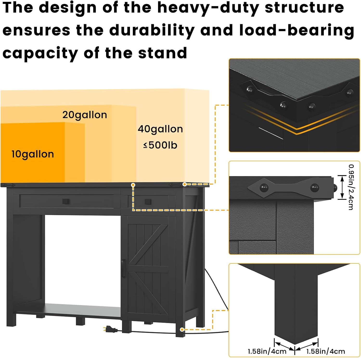 40 Gallon Aquarium Stand With Charging Station, Farmhouse Fish Tank Stand, Reptile Tank Stand Terrarium Stand with Drawer and Cabinet Storage, Sturdy Heavy Duty 41.9"×18.3" Tabletop - Black