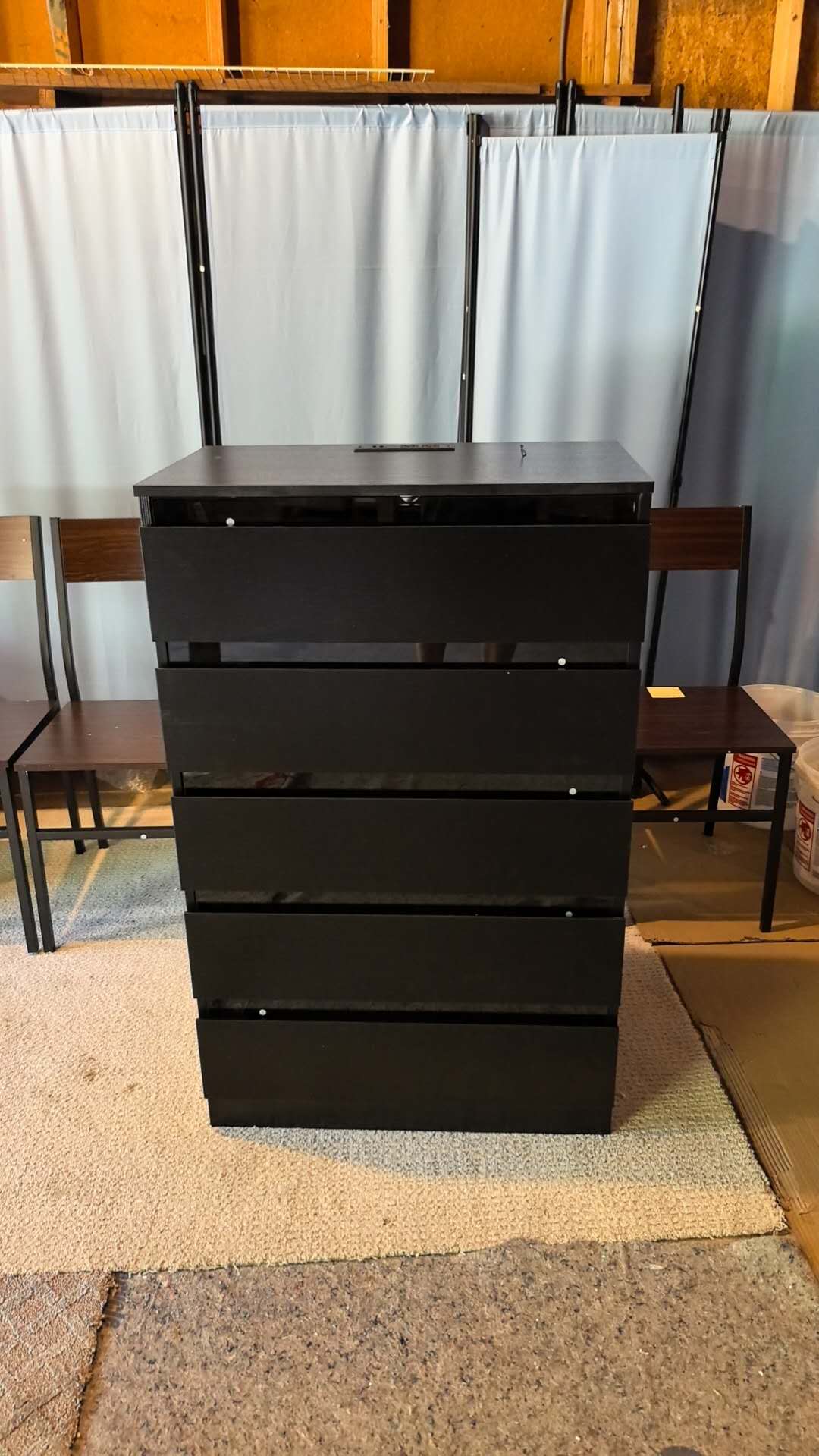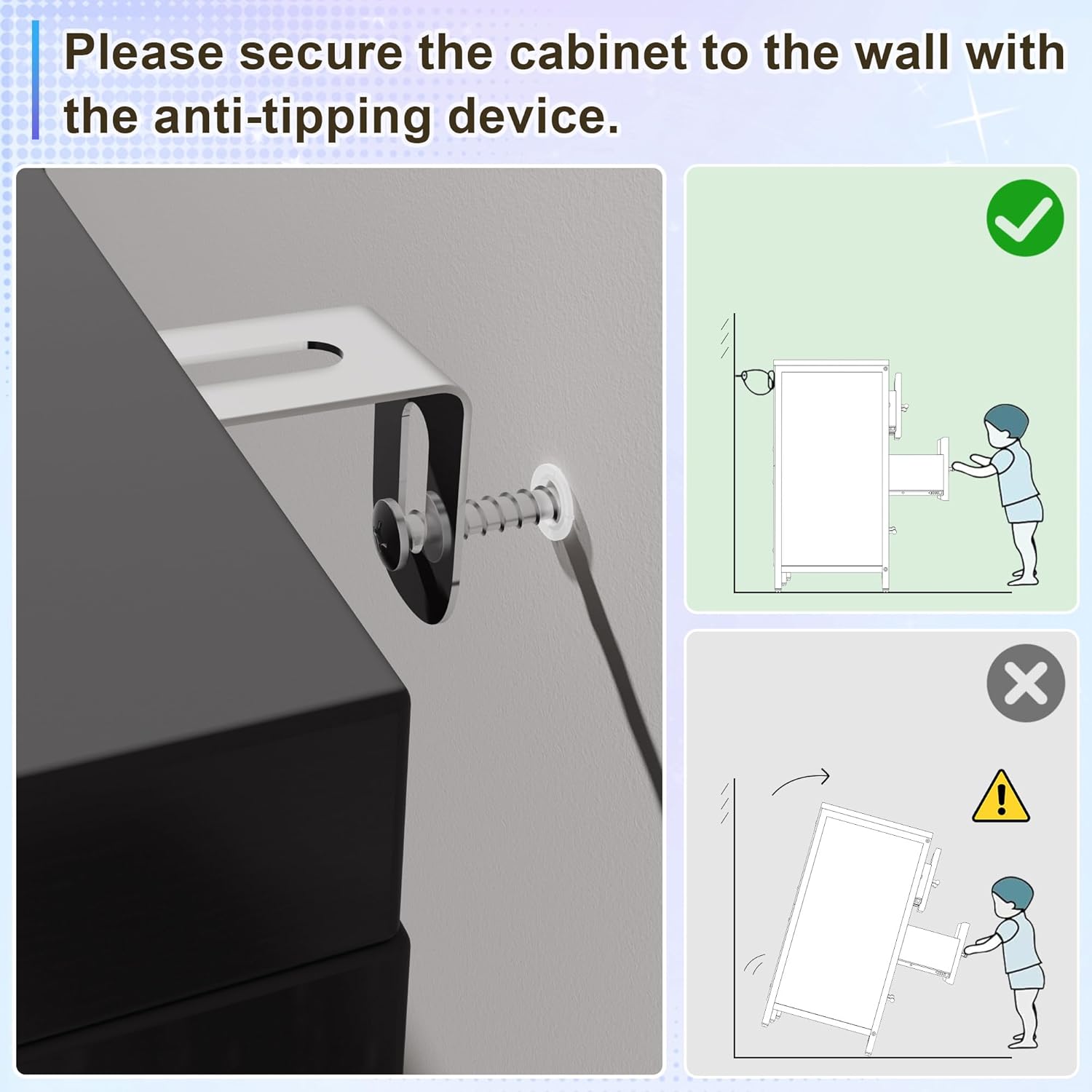 Unanchored furniture can tip over. This black dresser for bedroom shall be anchored to the wall with the enclosed safety fitting to prevent it from tipping over.