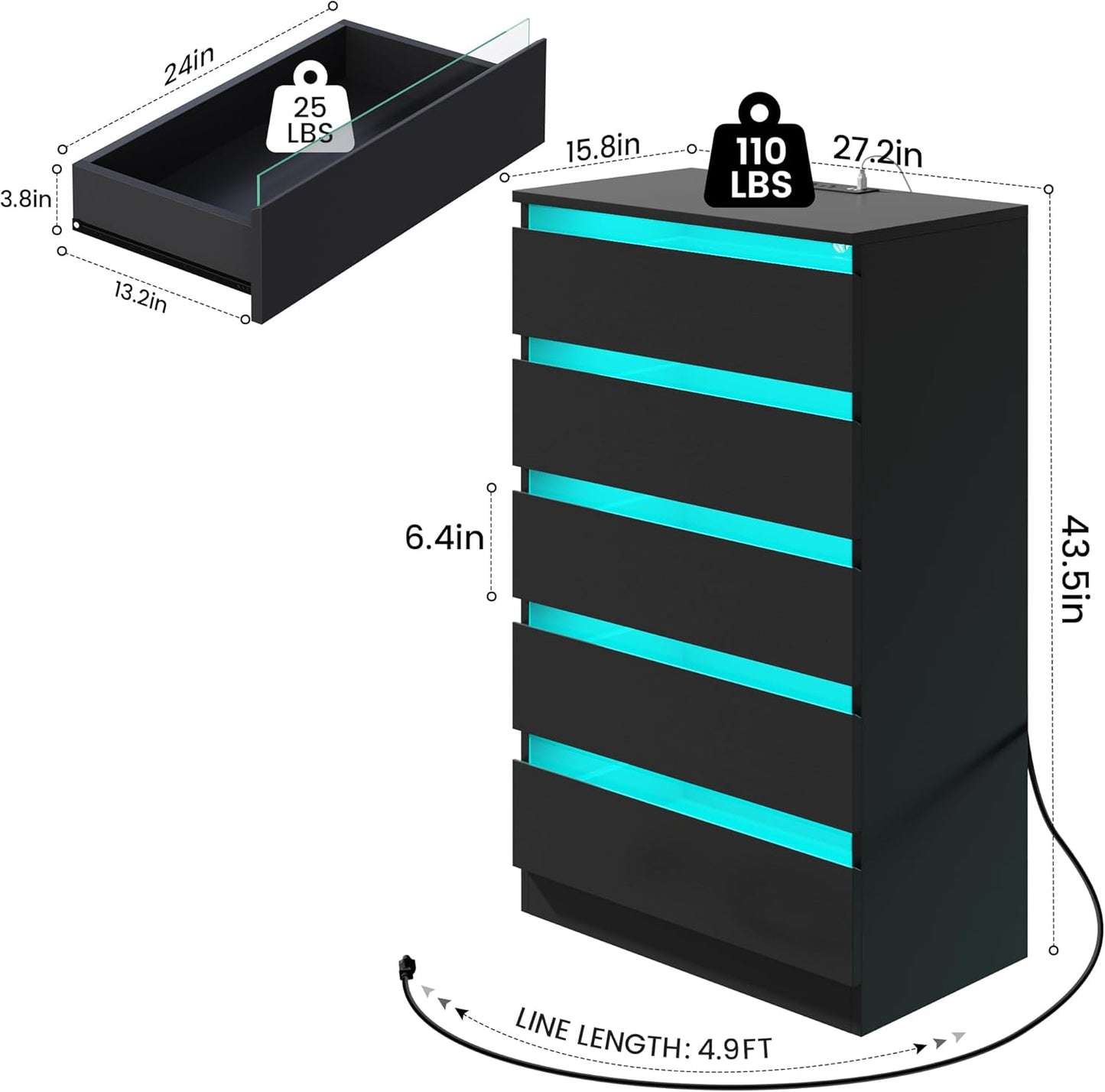 5 Drawer Tall Dresser with Power Outlets & LED Lights, Black Dresser with Embedded Handle, Modern Wood Dresser for Bedroom, Living Room, Hallway