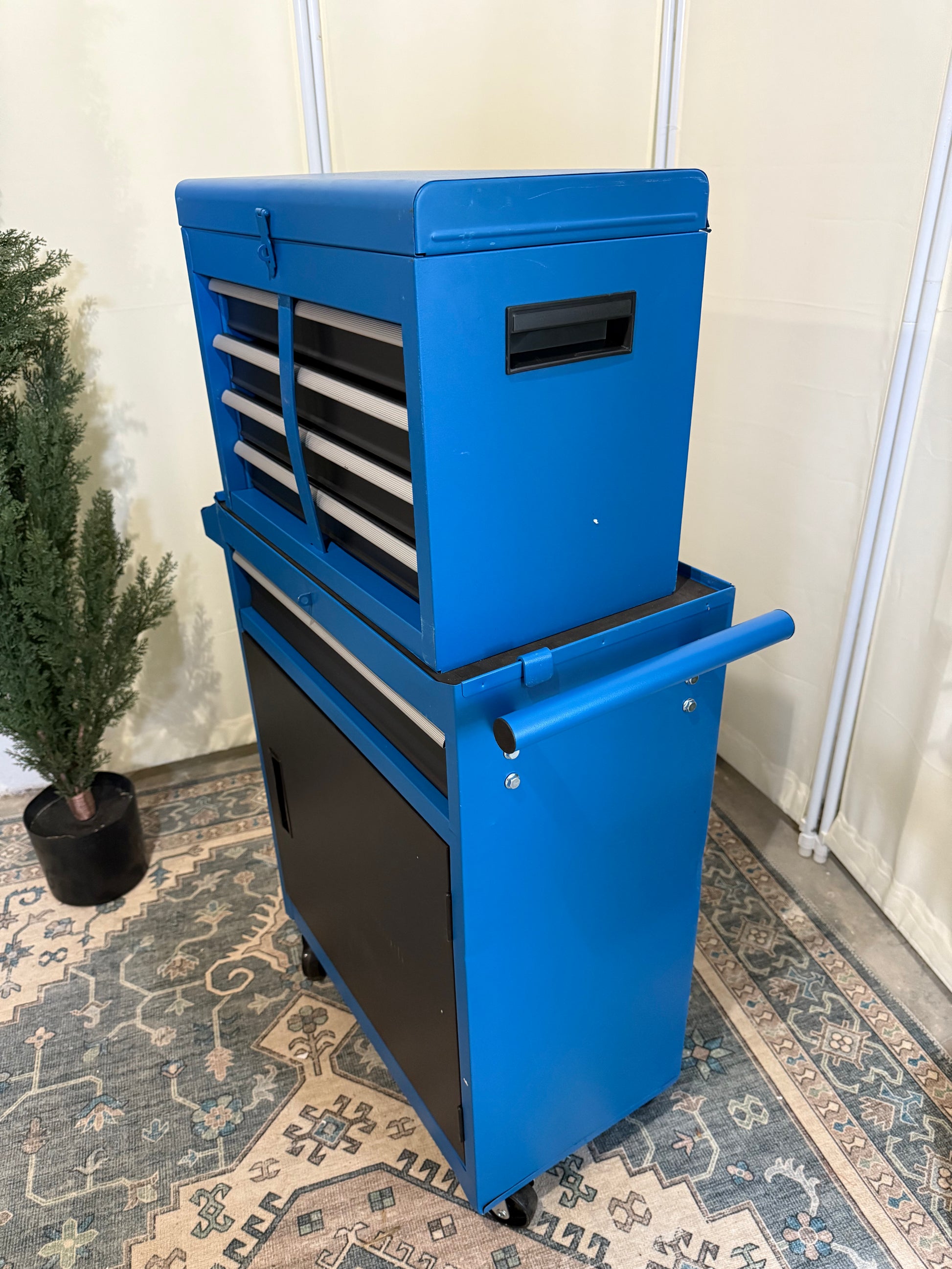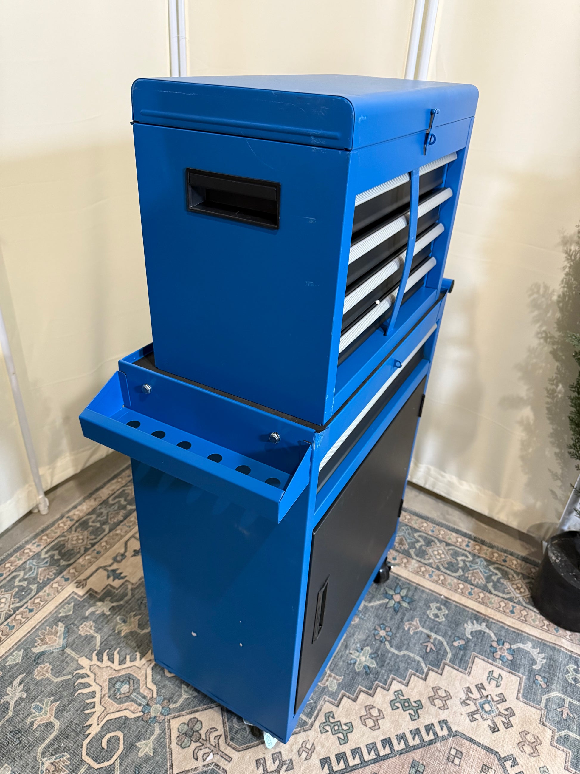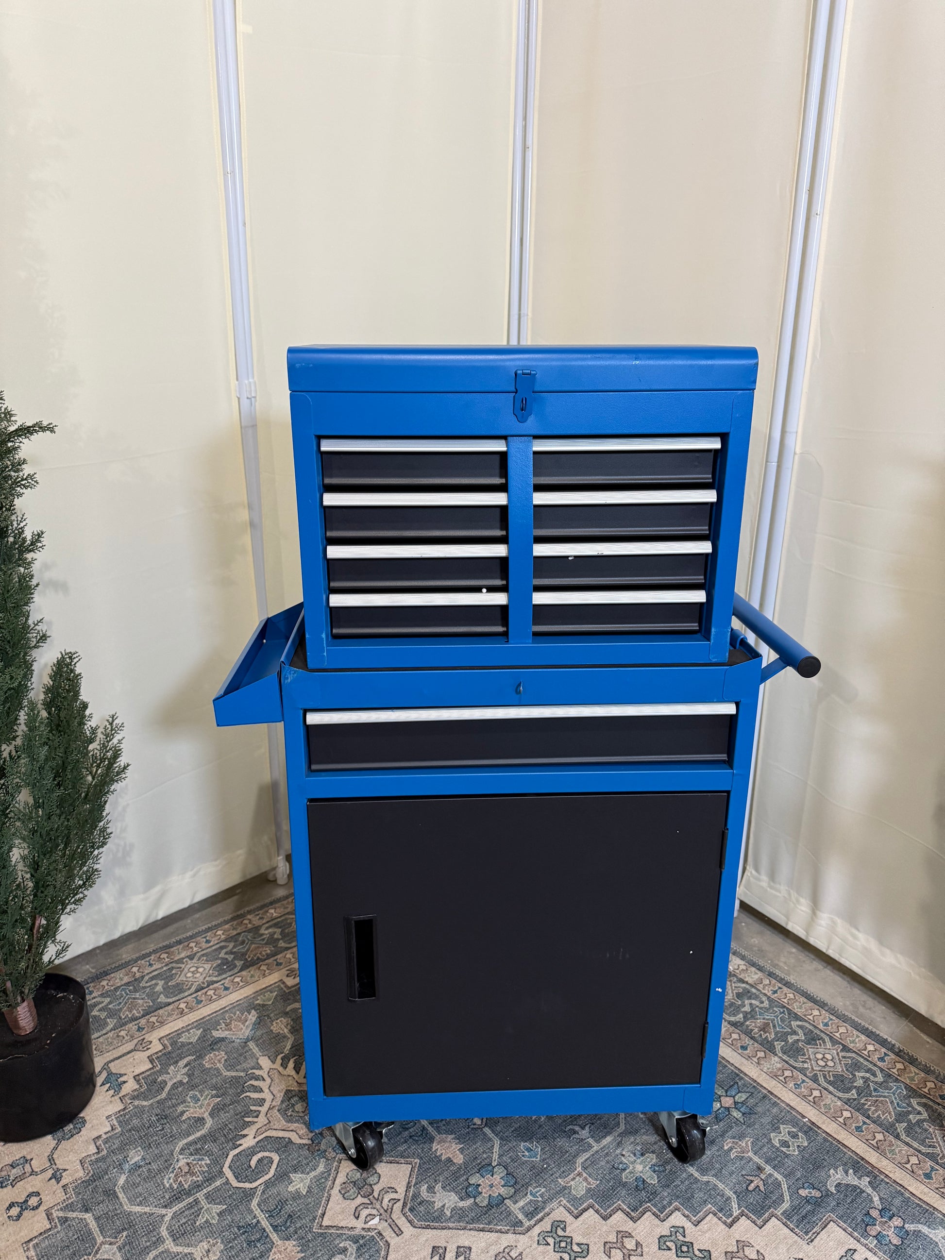 - Designed for easy transport and security, the tool chest features a handle and four wheels, making it easy to move around your workspace. Two of the wheels are lockable to keep the unit stable. Additionally, the toolbox is equipped with two locking levers to secure the drawers and base, along with a lockable clasp on the top toolbox to ensure the safety of your tools.