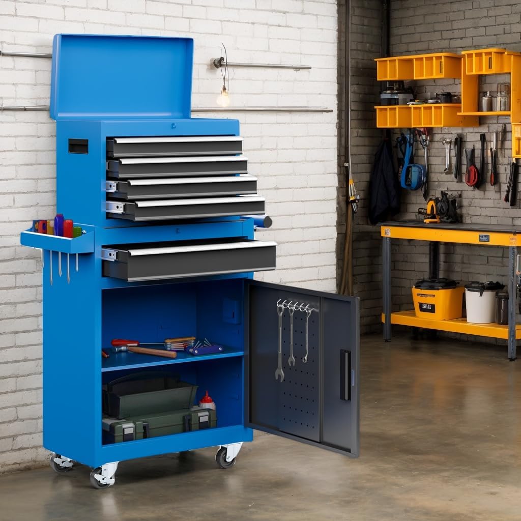- Offering ample storage space, this tool chest includes a top tray, five drawers, a large bottom cabinet, side tool racks, and four detachable hooks. The base cabinet also includes three adjustable shelves, allowing for customizable storage to meet your needs.