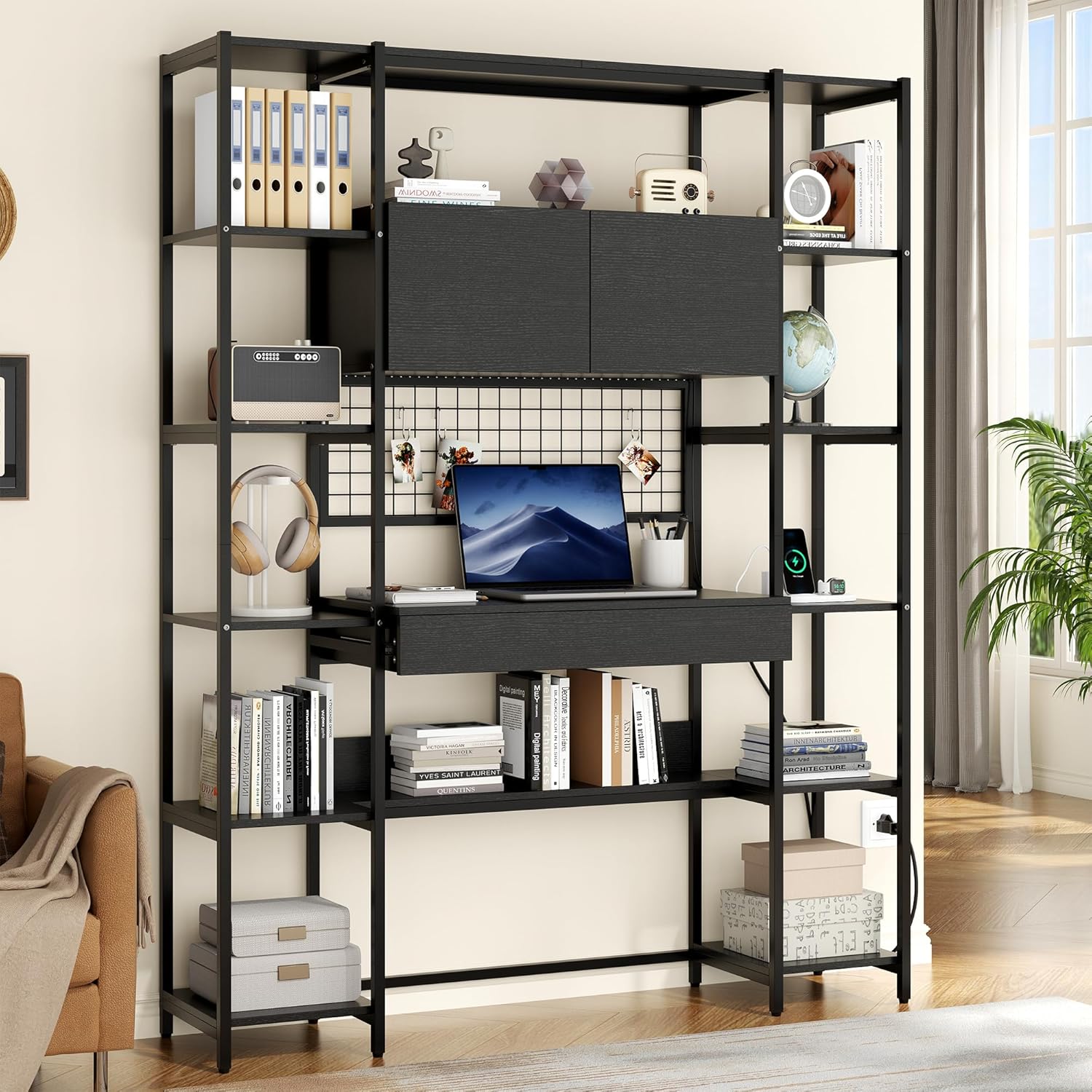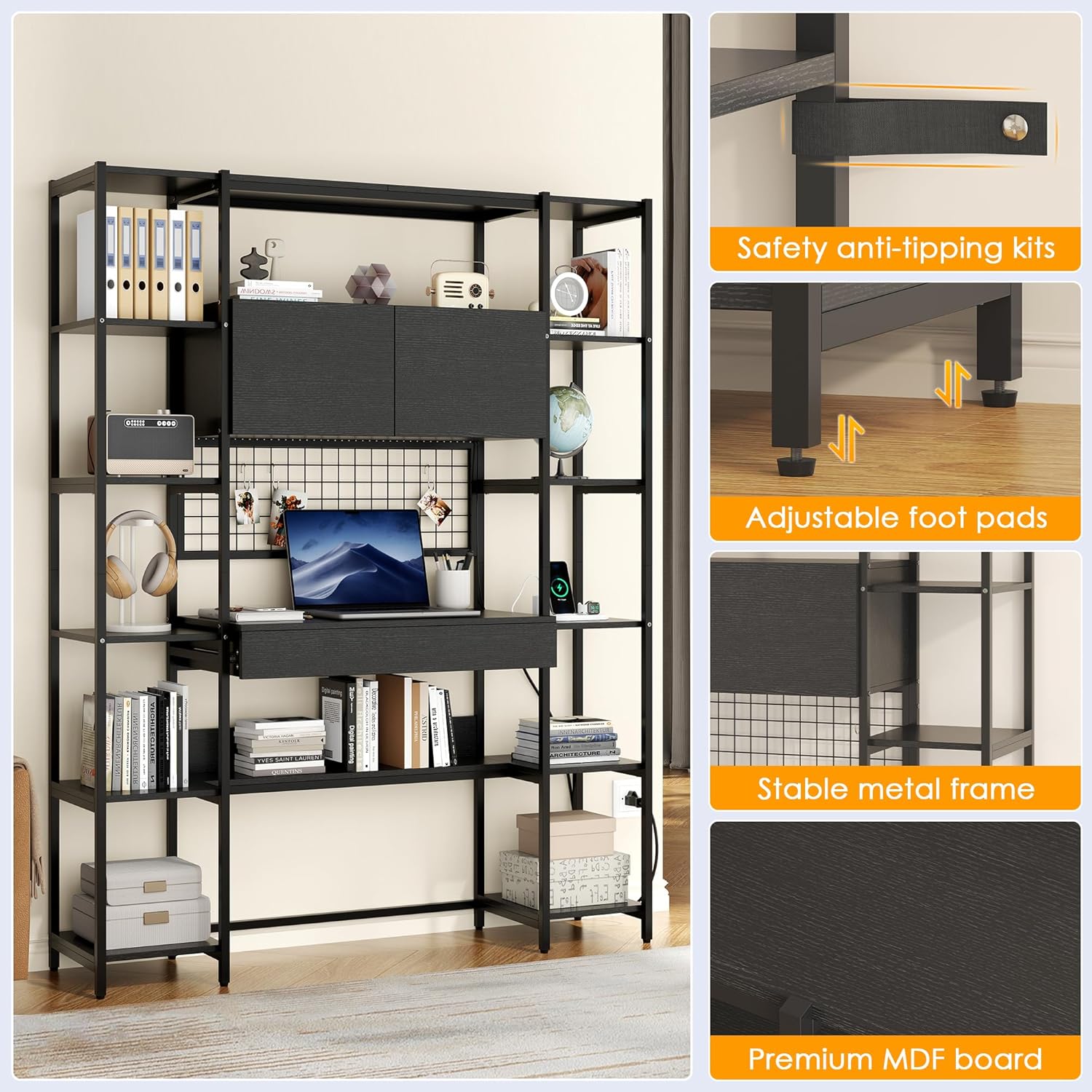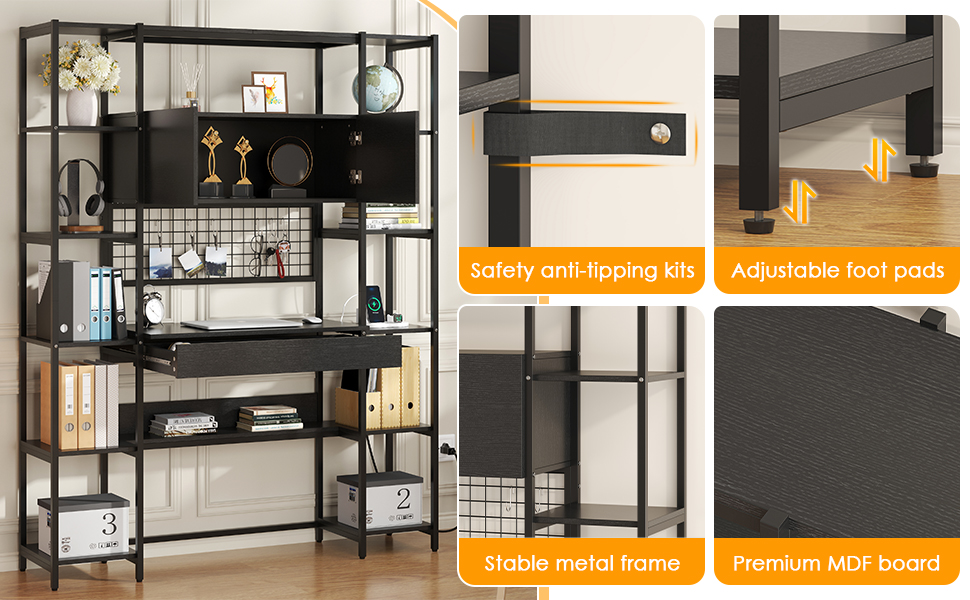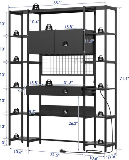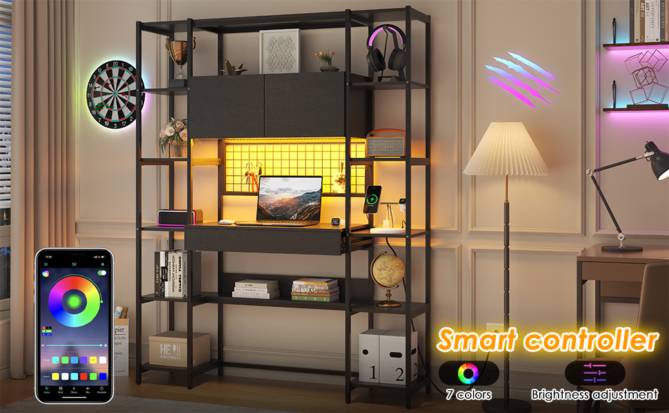5 Tiers Black Bookshelf with Home Office Desk and RGB Lights and Power Outlet, 71.1" Tall Book Shelf with Drawer & Storage Cabinet & 12 Storage Shelves, Large Bookcase with 2 Doors, Black