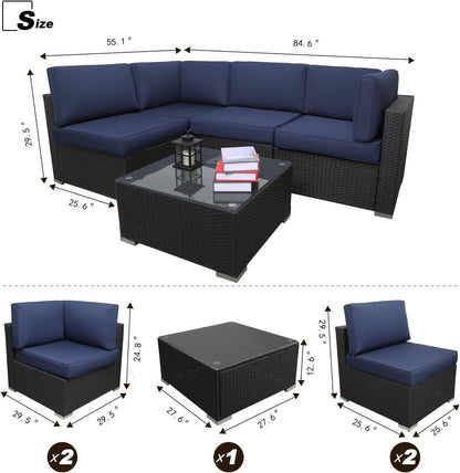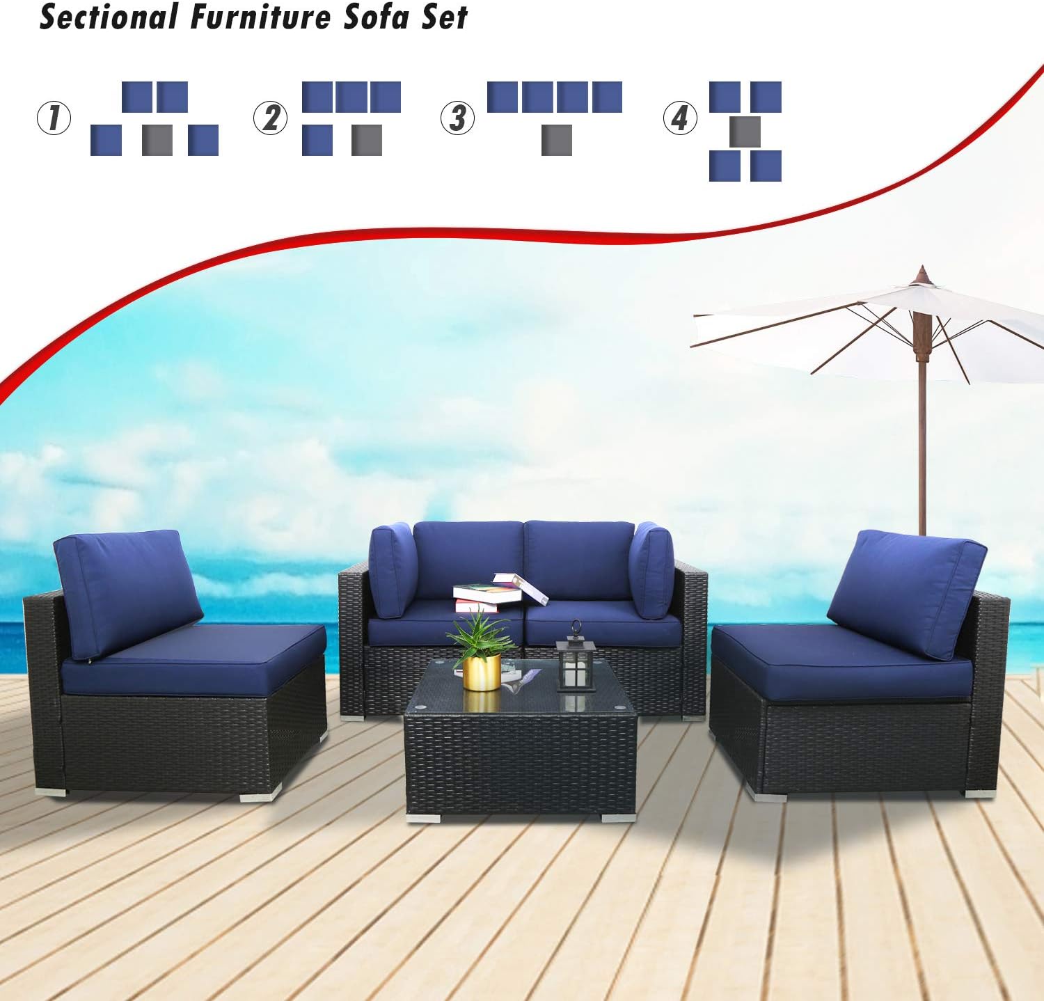 5pcs Outdoor Patio Furniture Set,Wicker Sofa Chairs PE Rattan Thick Cushions Couch with Tea Table and Washable Cushion(Dark Blue)