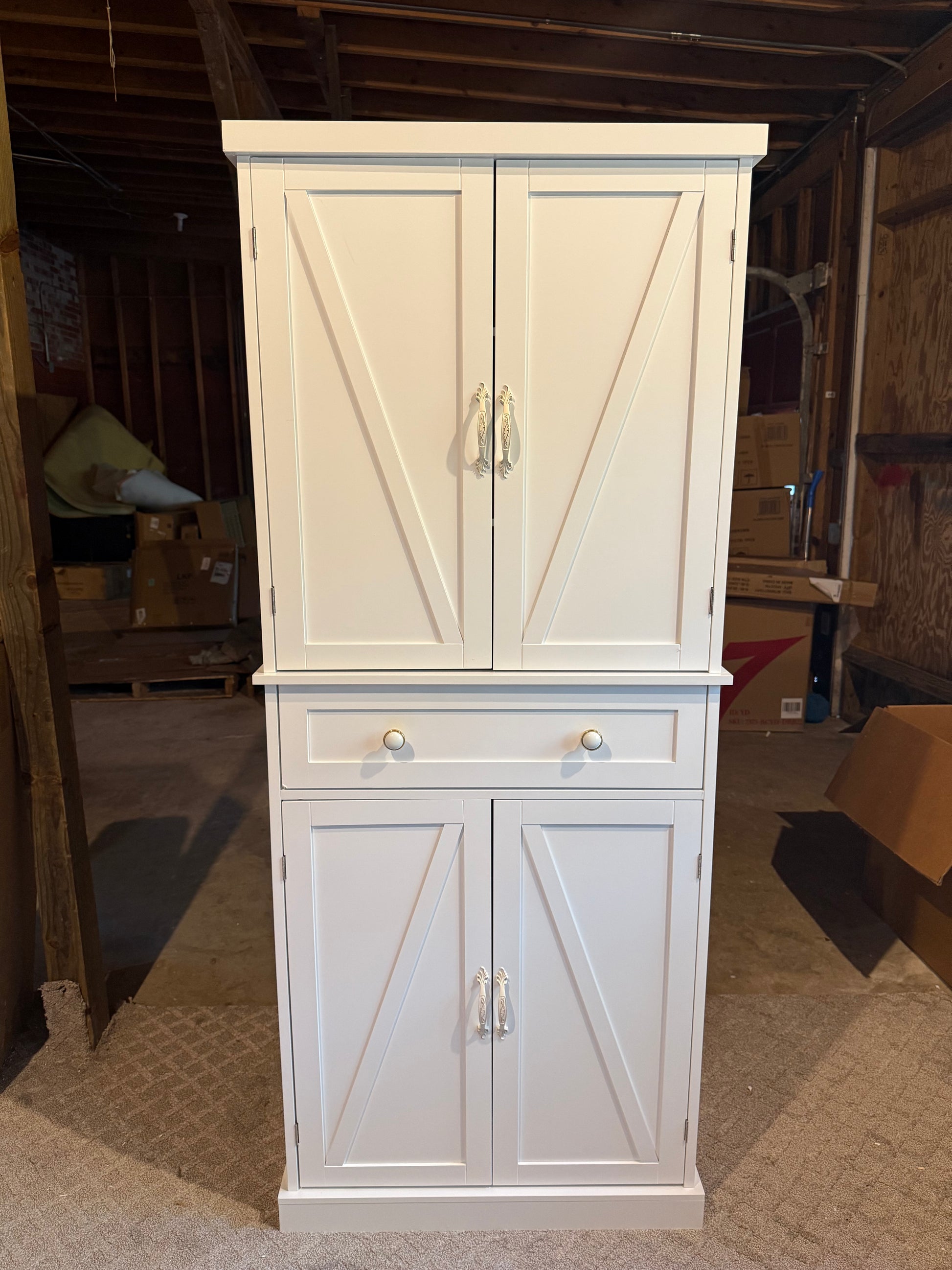 Sturdy Construction: Farmhouse pantry cabinet is crafted from laminated fiberboard, it features a clean-lined silhouette and a neutral solid finish for a versatile addition to any ensemble.