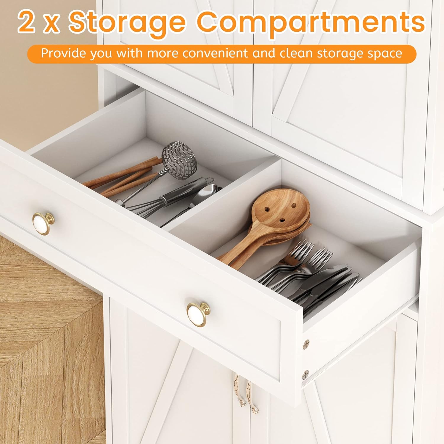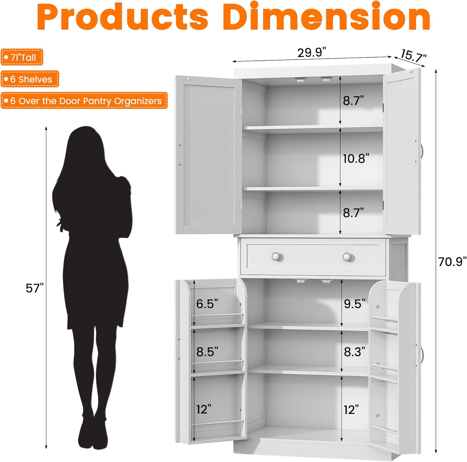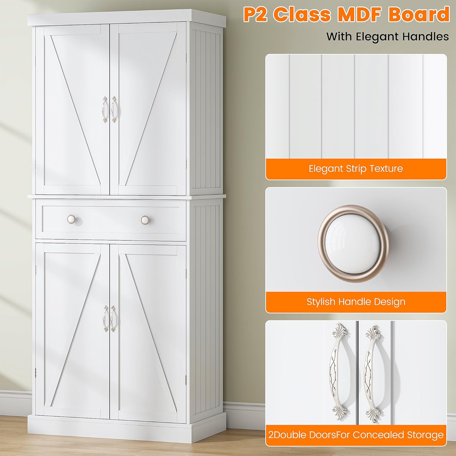 72“ Kitchen Pantry Cabinet White, Tall Pantry Storage Cabinet with Adjustable Shelves and Drawer, Kitchen Buffet Cupboards Sideboard for Home Office Use (16" D x 30" W x 72" H)