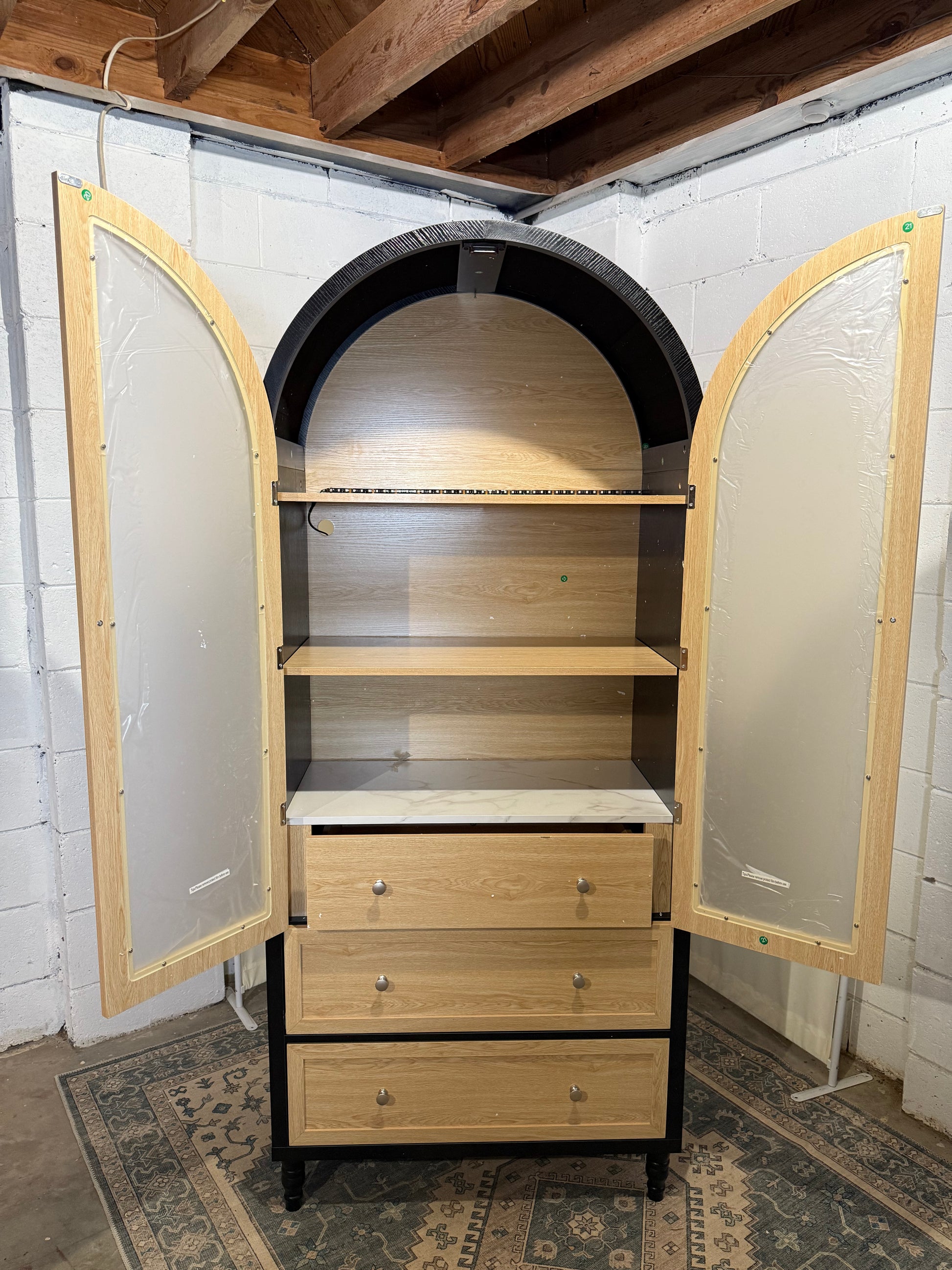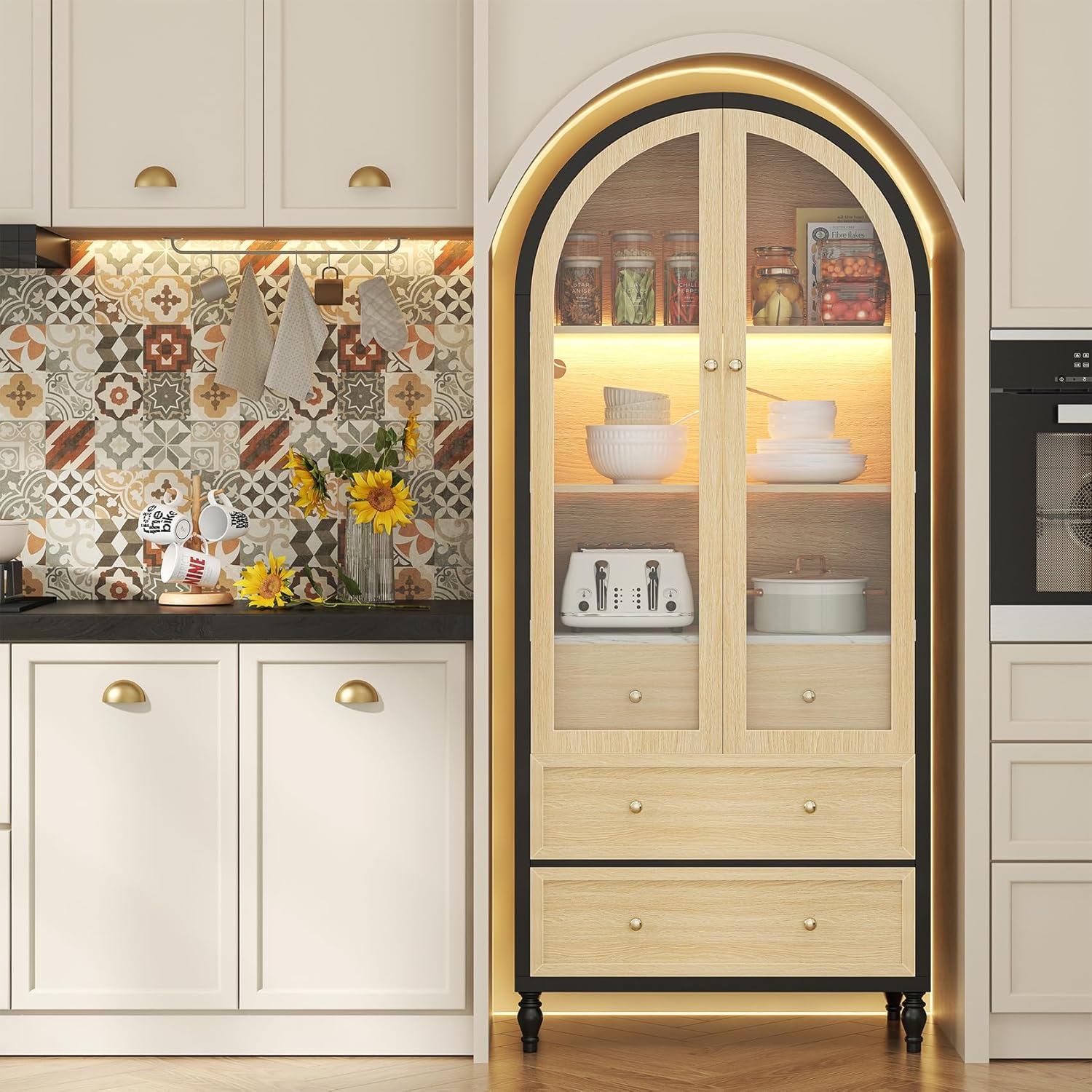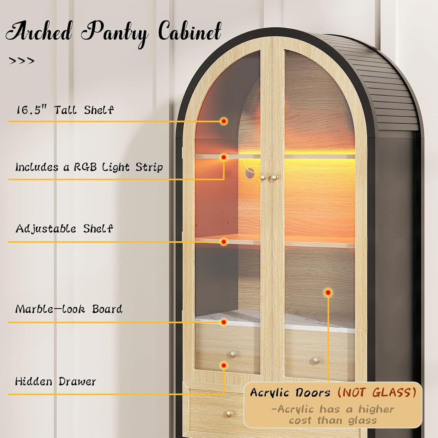 73 Inch Tall Arched Cabinet with Doors, Arched Storage Cabinet, Black-Oak Kitchen Pantry, LED Lighted Display Case, Boho Arch Bookshelf for Kitchen Dining Room Living Room, Black