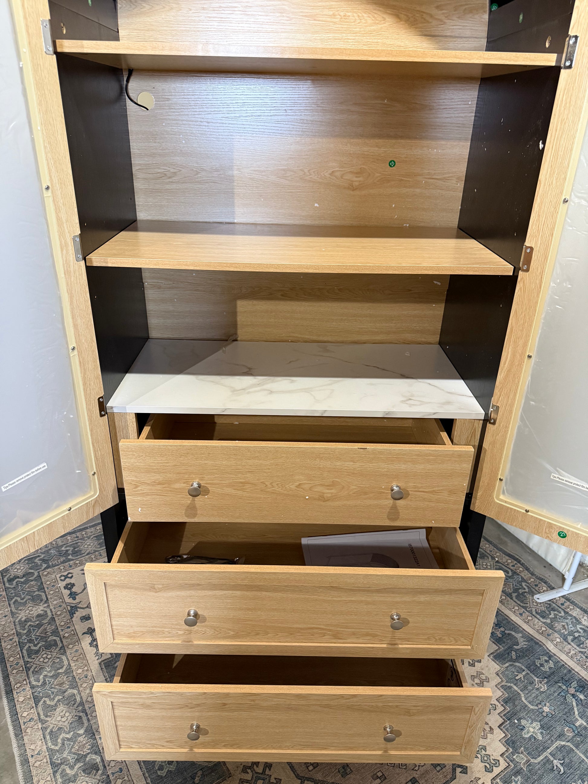 This elegant storage cabinet has a large storage space, it can provide additional storage space in the bathroom, kitchen or hallway, etc. It has plenty of space for you to store and organize everyday items such as food, drinks, cups and plates or other groceries, etc.
