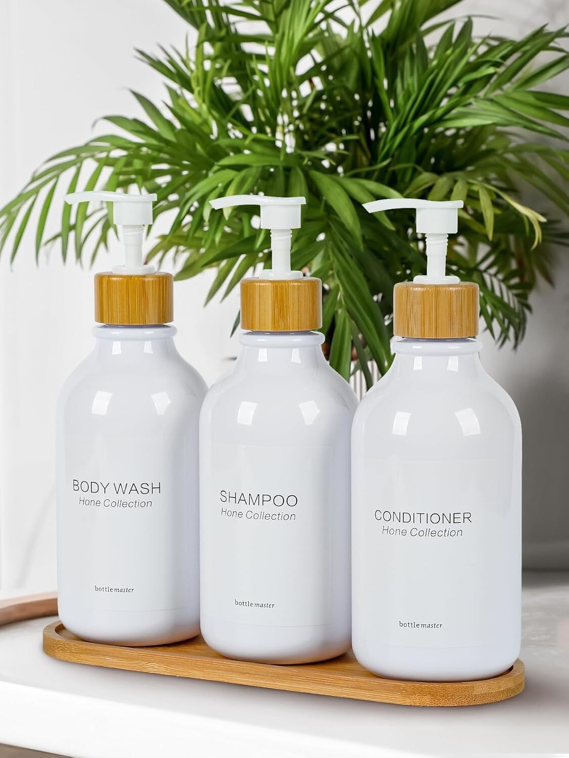 This bathroom shampoo dispenser set is perfect apothecary decor for your farmhouse bathroom. The plastic bottles are shower safe and make your bathroom look instantly organized. Reusable containers are great for the environment, especially if you buy shampoo in bulk. These decorative accessories are the nice color for neutral bathroom decor. Containers hold 16 oz each and re 8 inches tall with the pump lid extended. Perfect for most bathroom shower niches. NO BAMBOO Tray included.Shipping and Handling