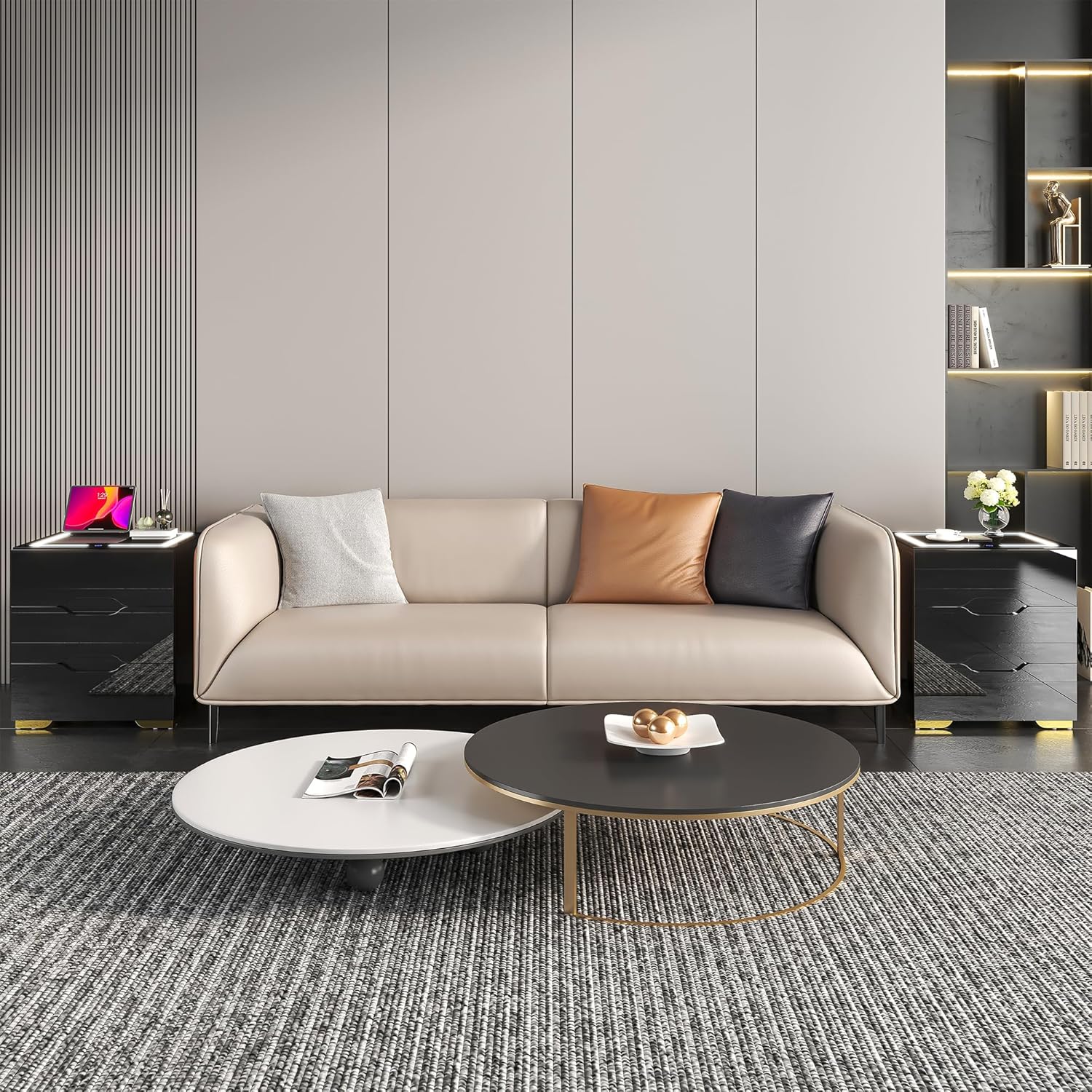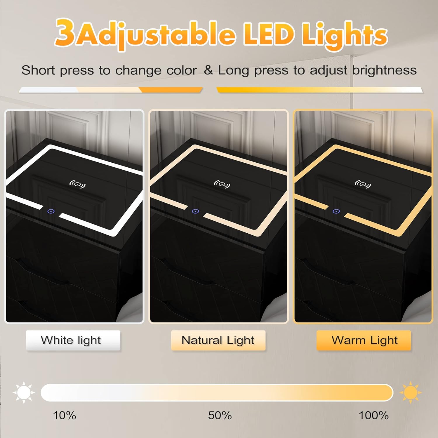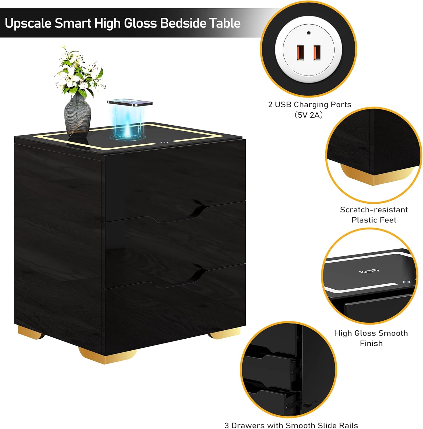 Black Smart Nightstand with Wireless Charging Station & USB Charging, High Gloss Smart Bedside Table with Adjustable LED Lights, End Table Organizer for Bedroom Living Room Office Use