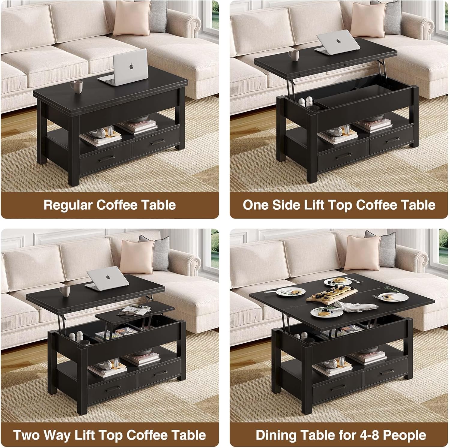 Coffee Table Lift Top, Multi-Function Convertible Coffee Table with Drawers and Hidden Compartment, Converts to Dining Table for Living Room, Home Office,Black