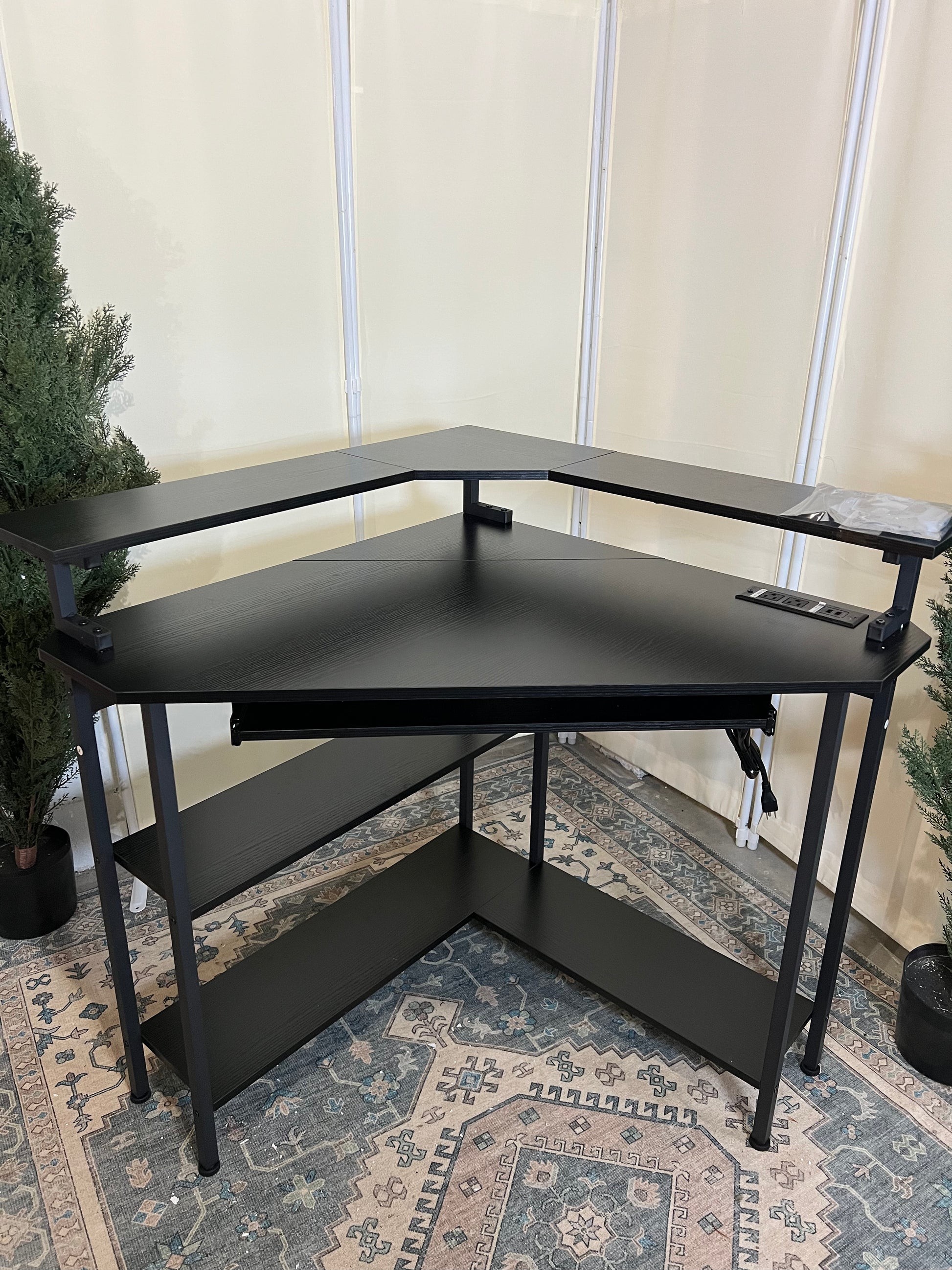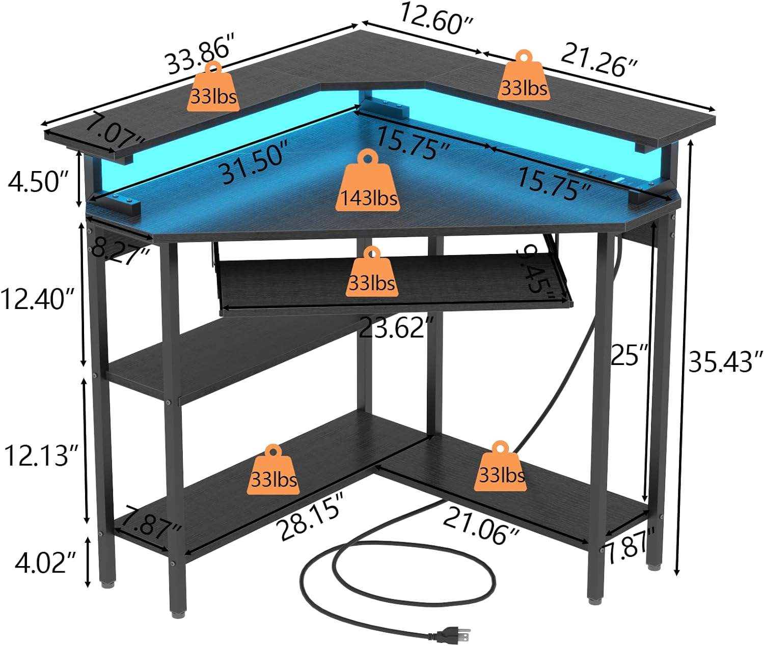 This corner desk is equipped with a spacious desktop, a dedicated monitor stand, a convenient keyboard tray, and three-tier storage shelves at the bottom. It features charging station and LED light, providing convenience and creating a different visual effects.