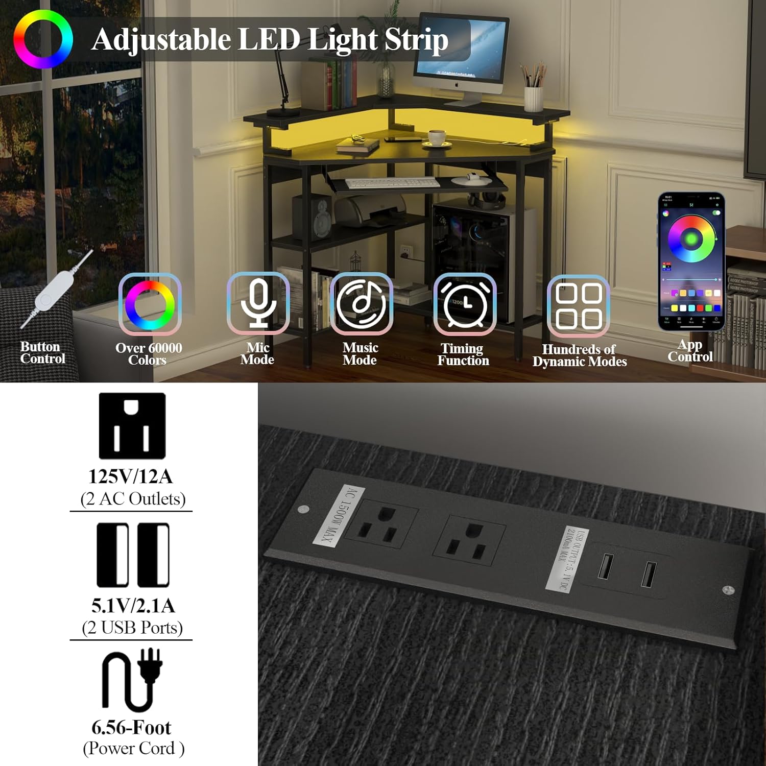 Corner Desk with Charging Station & LED Light, Triangle Corner Desk with Monitor Stand & Keyboard Tray for Small Space, Gaming Computer Desk with Storage Shelves for Home Office (Black)