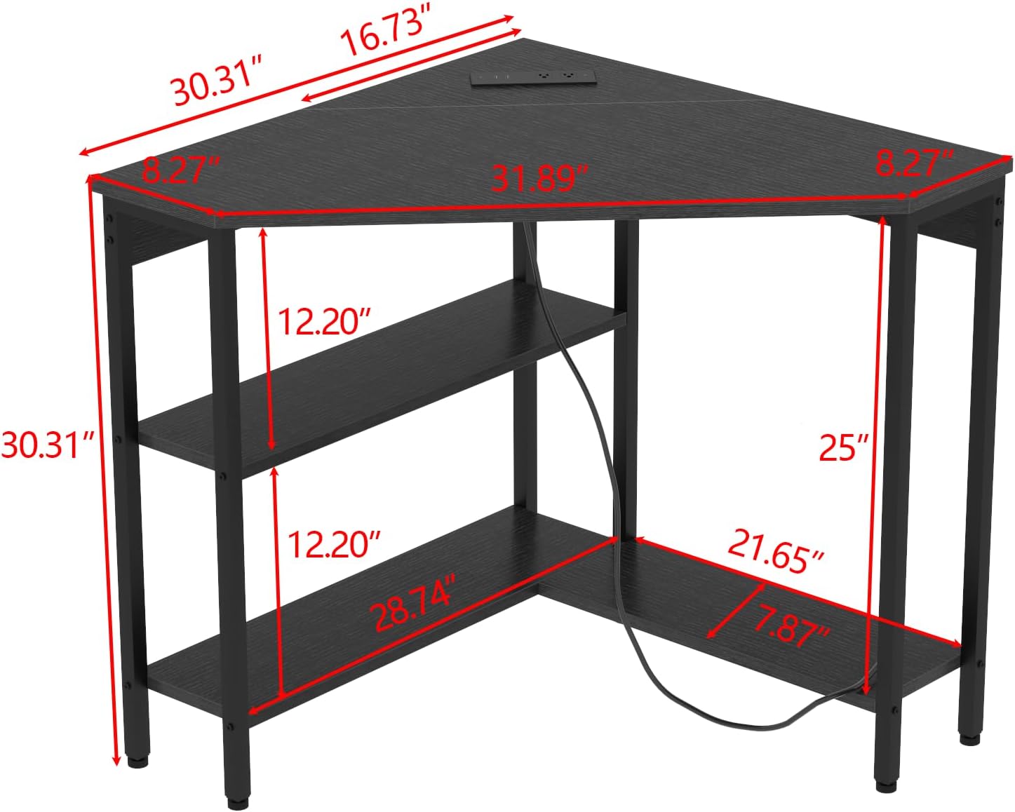 Corner Desk with Outlets & USB Ports, 90 Degree Triangle Corner Table with CPU Stand & Storage Shelves for Small Space, Computer Table with Charging Station for Home Office Bedroom (Black)