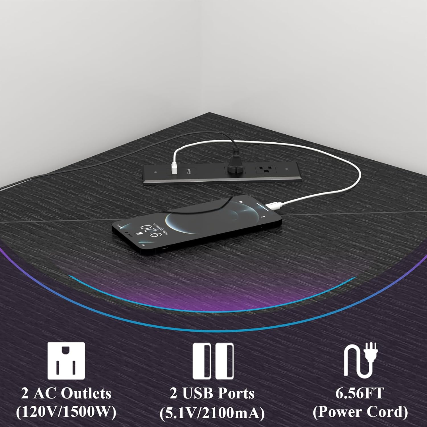The corner computer desk has a 6.56ft integrated power strip with 2 power outlets and 2 USB ports.