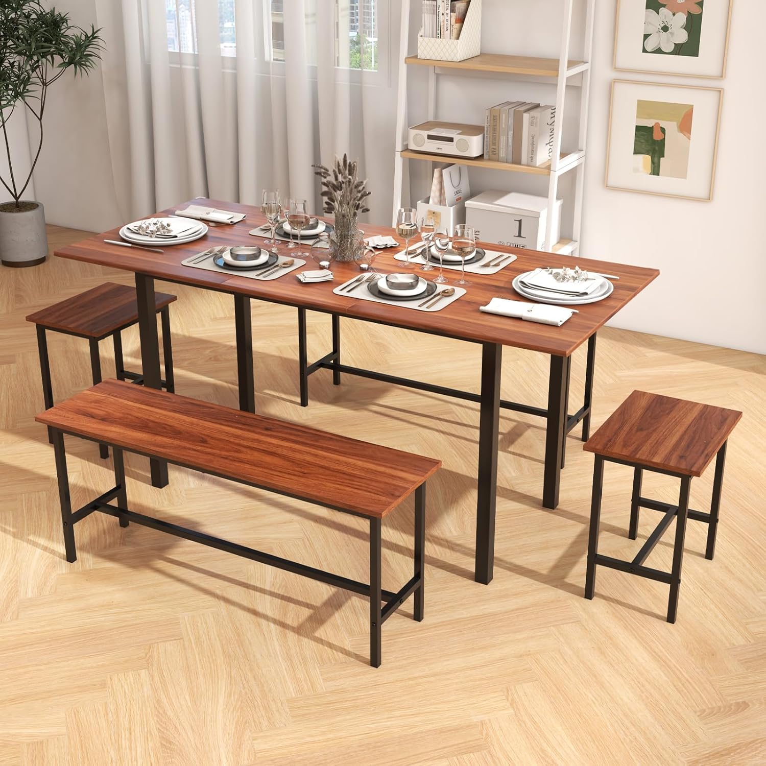 Dining Table Set for 4-6, 5-Piece Kitchen Table Chairs Set, 63” Extendable Table with 2 Benches, 2 Stools, Dinette Table Set, Breakfast Nook Table Set, Dining Room Table Set