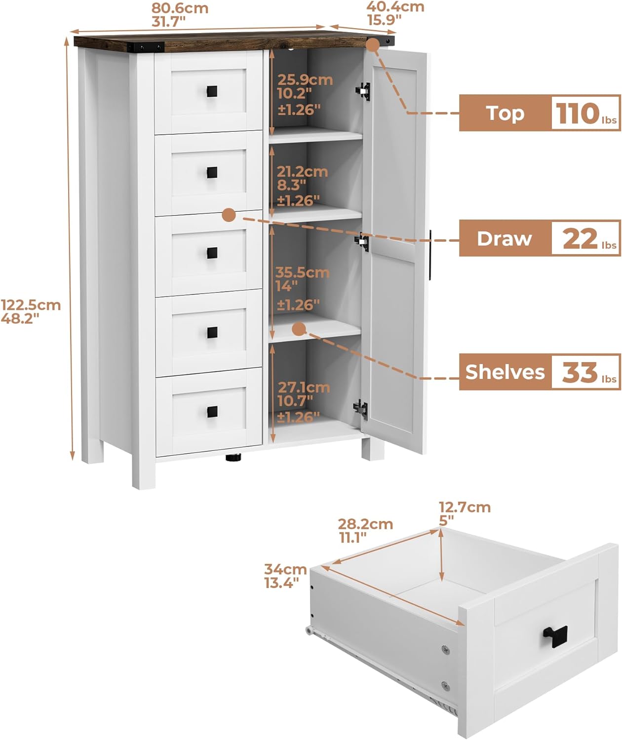 Farmhouse Dresser Storage Cabinet Chest of Drawer for Bedroom, 5 Drawer Dresser with Barn Door, 48 Inch Tall White Wood Dresser, Adjustable Shelves, Rustic, for Living Room, Entryway, Hallway