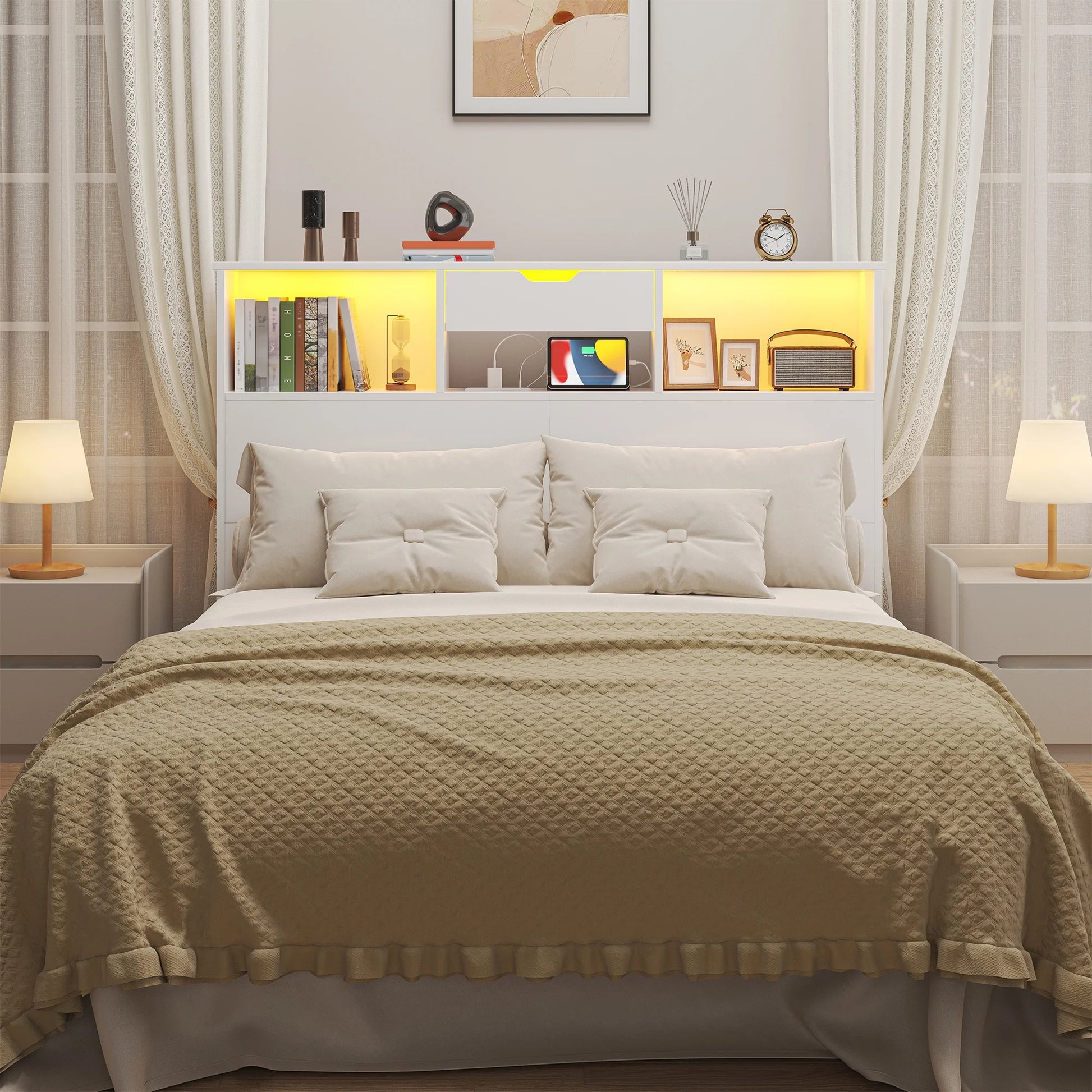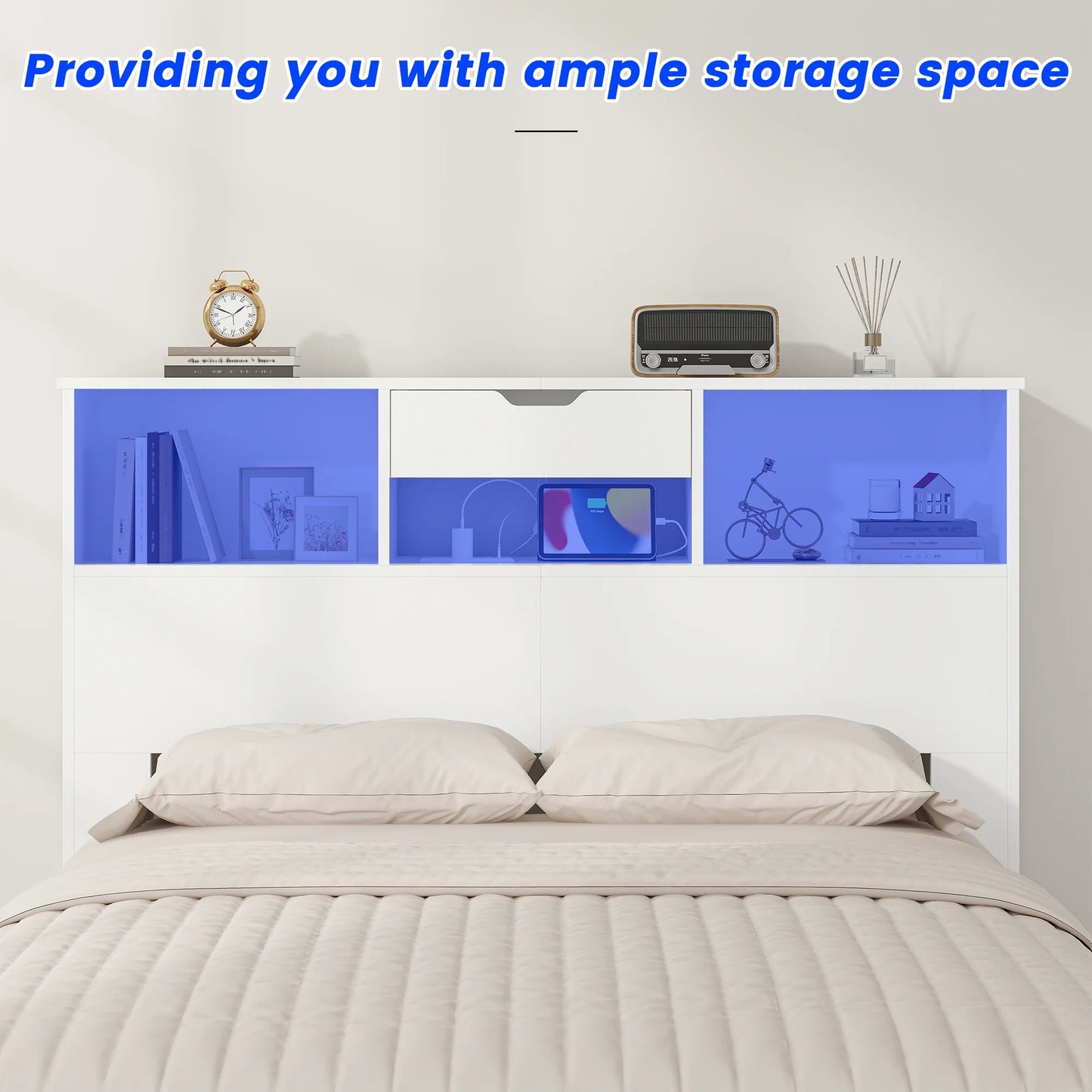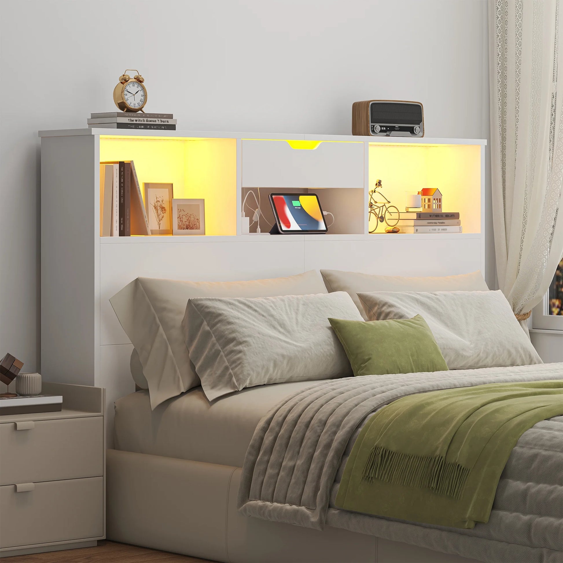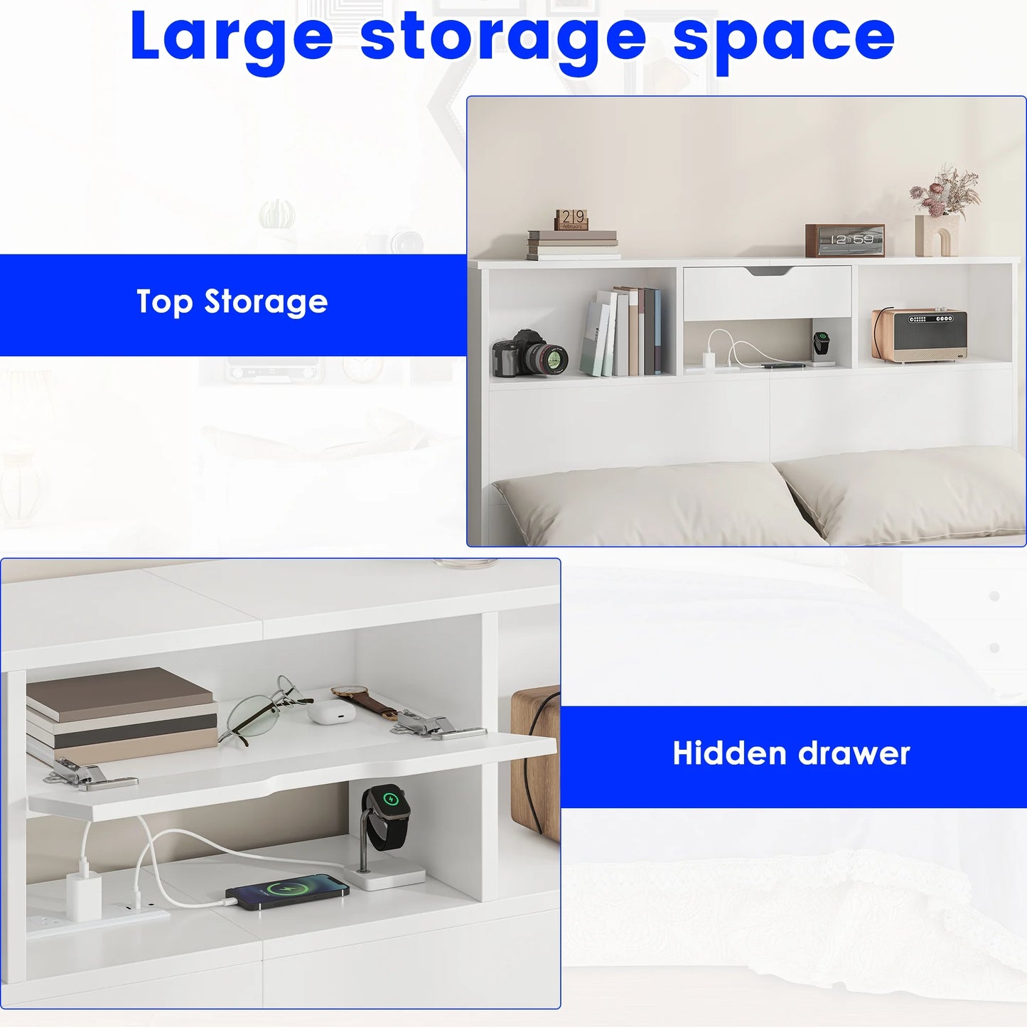 Full/Queen Headboard with Storage Shelf and Drawers, Morden White Headboard with Charging Station & LED Lights, Wood Deep Bookcase Headboards for Bedroom, 2 Tiers Storage, White