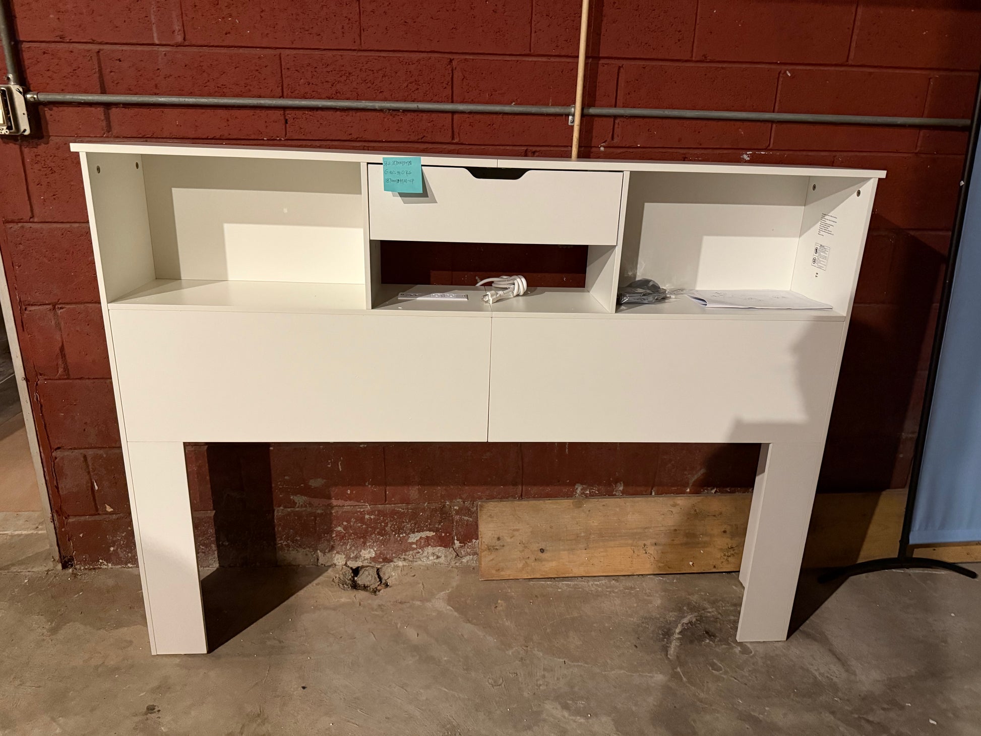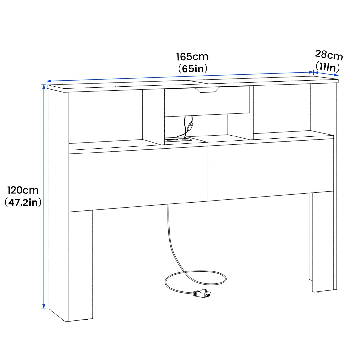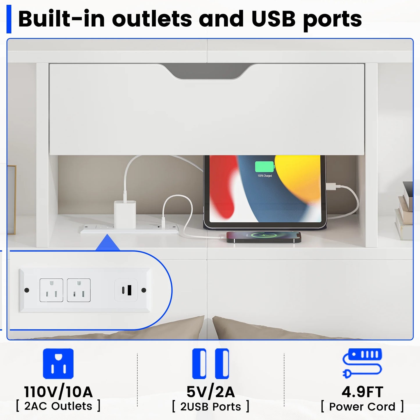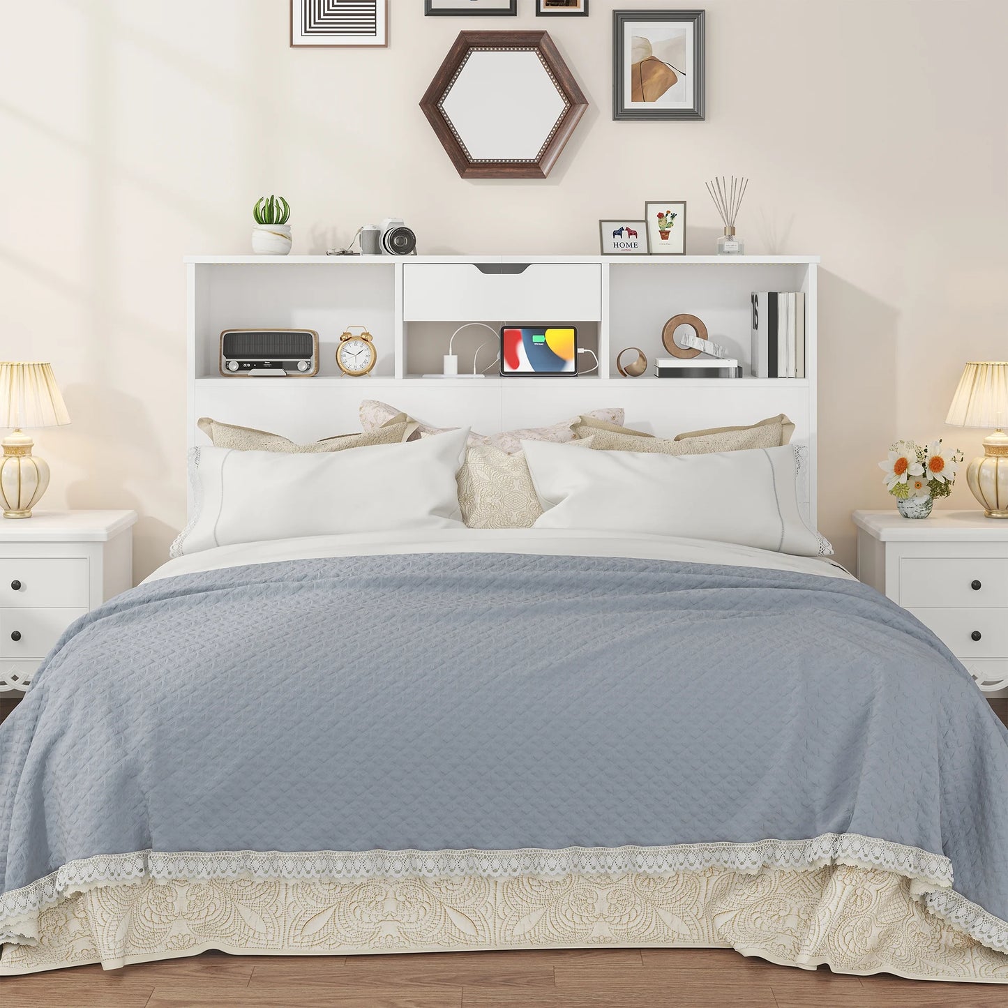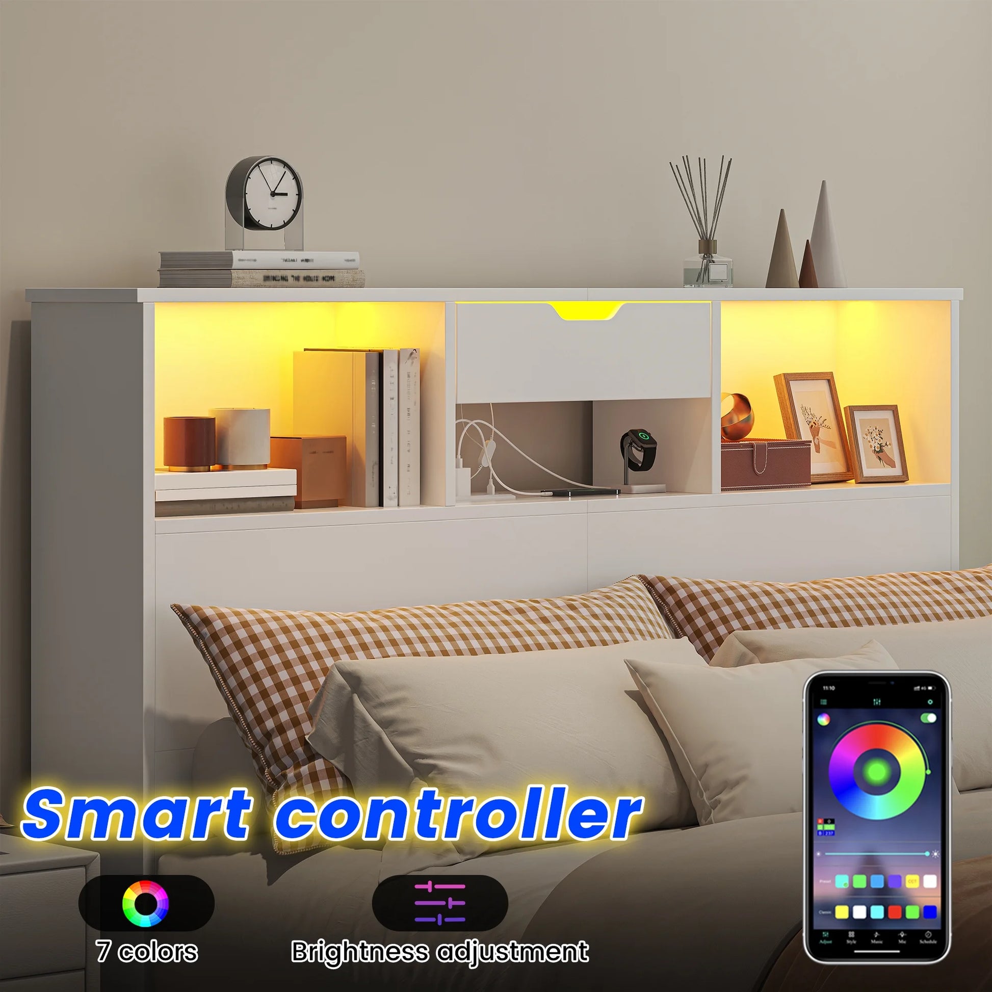 Full/Queen Headboard with Storage Shelf and Drawers, Morden White Headboard with Charging Station & LED Lights, Wood Deep Bookcase Headboards for Bedroom, 2 Tiers Storage, White