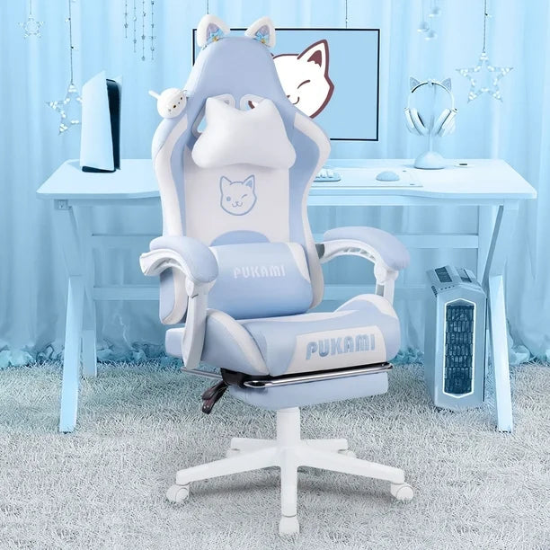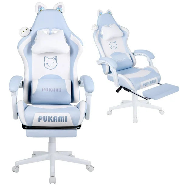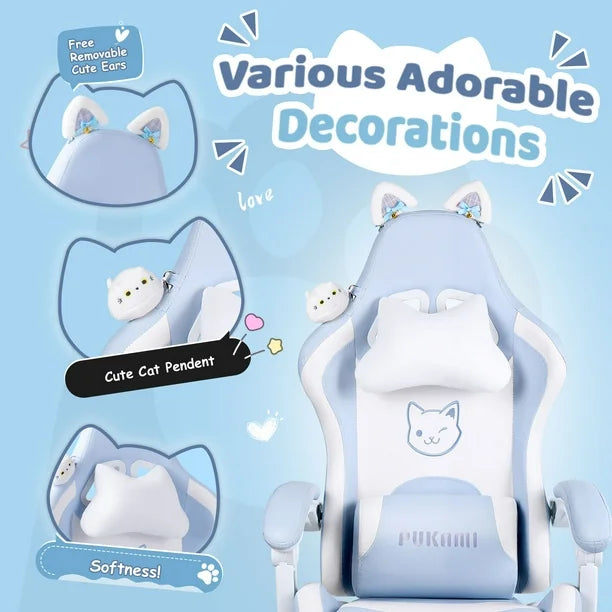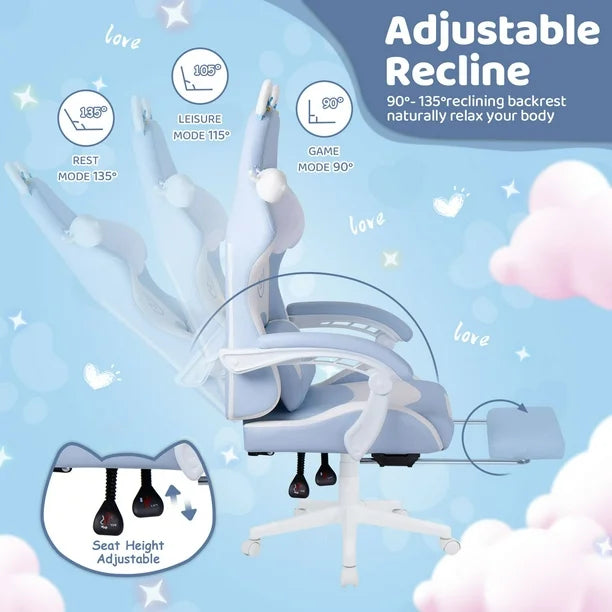 Gaming Chair with Cat Paw Lumbar Cushion and Cat Ears for Girls, Reclining Office Computer Chair with Footrest for Adults, Teens