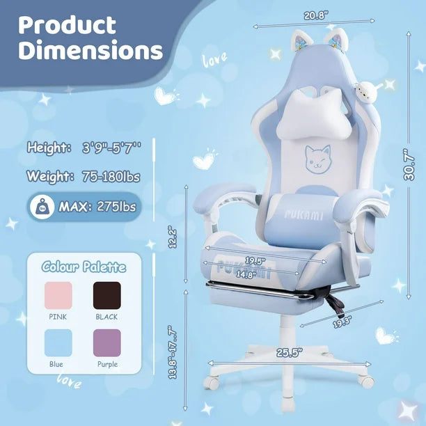 š¾ćCute Cat ShapećDimensions: 19.3"D x 20.8"W x 48.4"H. Waleaf Gaming Chair is unique for its cute cat ears on top of its back and fluffy cat paws pillow. The headrest can also adjust up and down. The cat head logo and brand logo are presented with embroidery, which is such a kawaii way to show off this chair!
