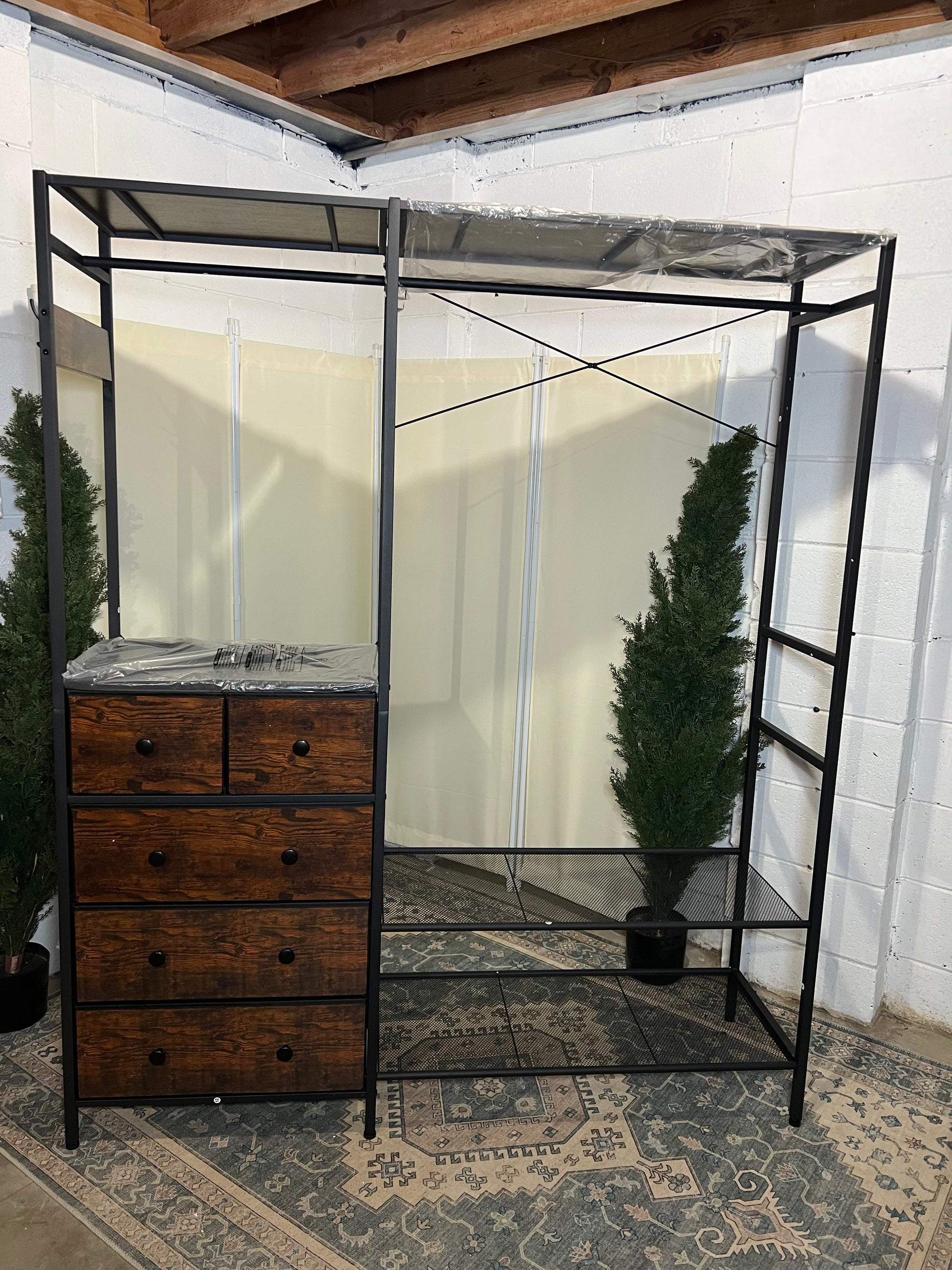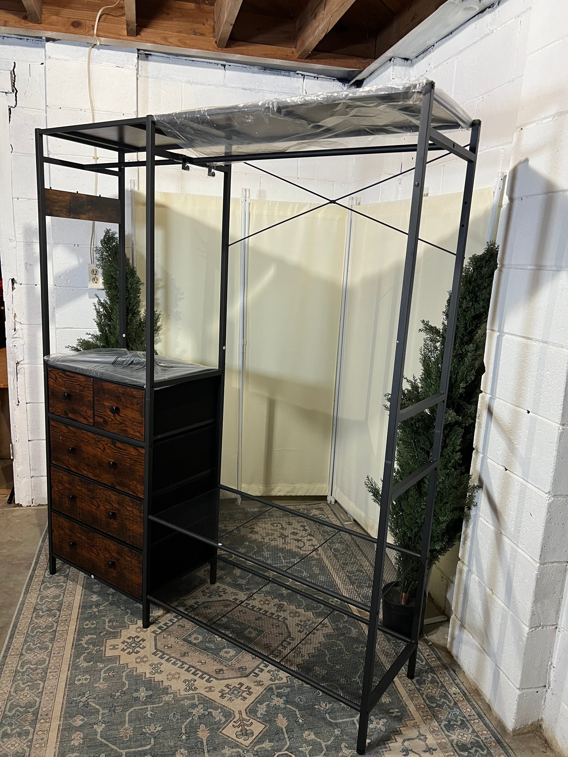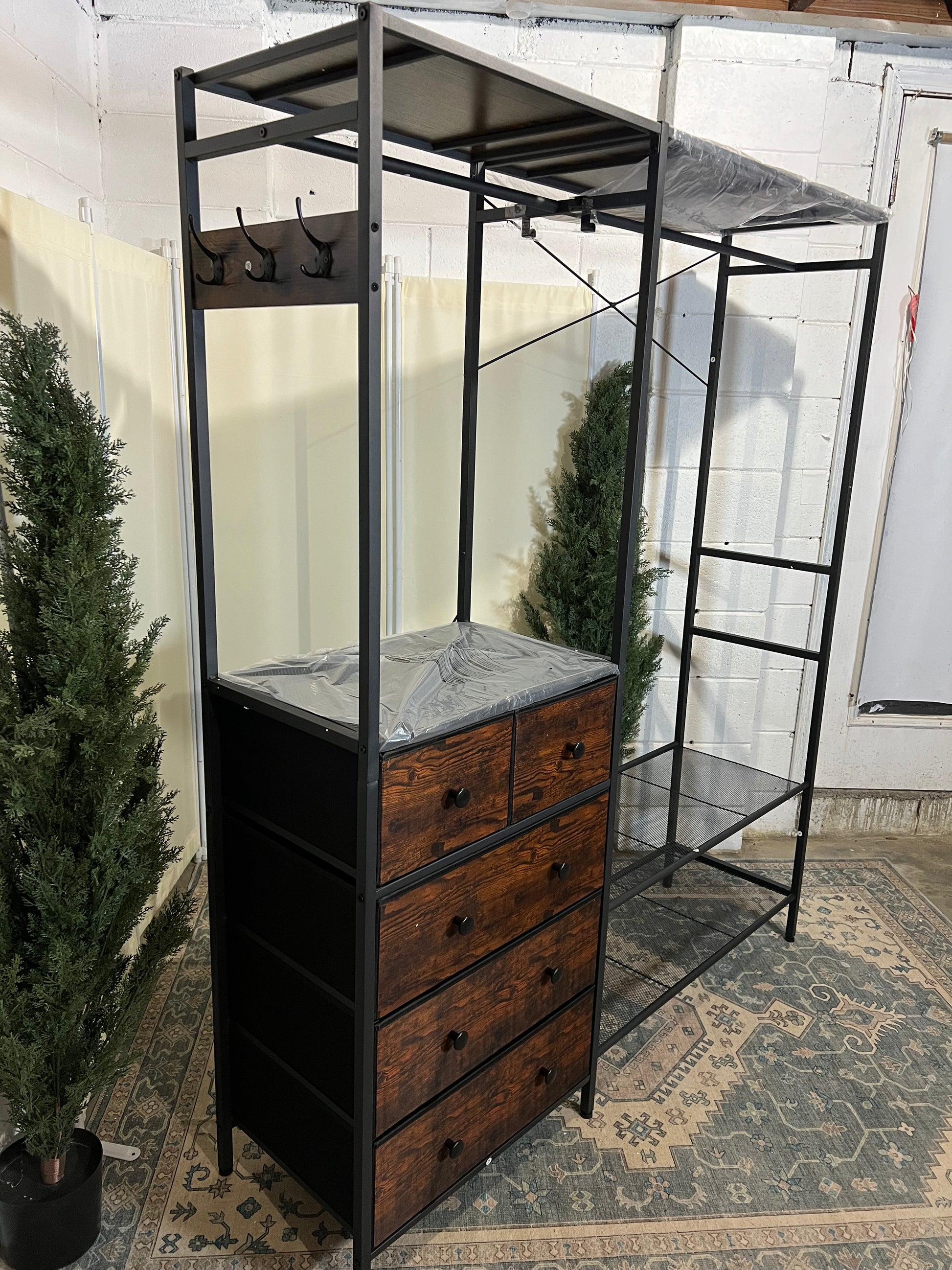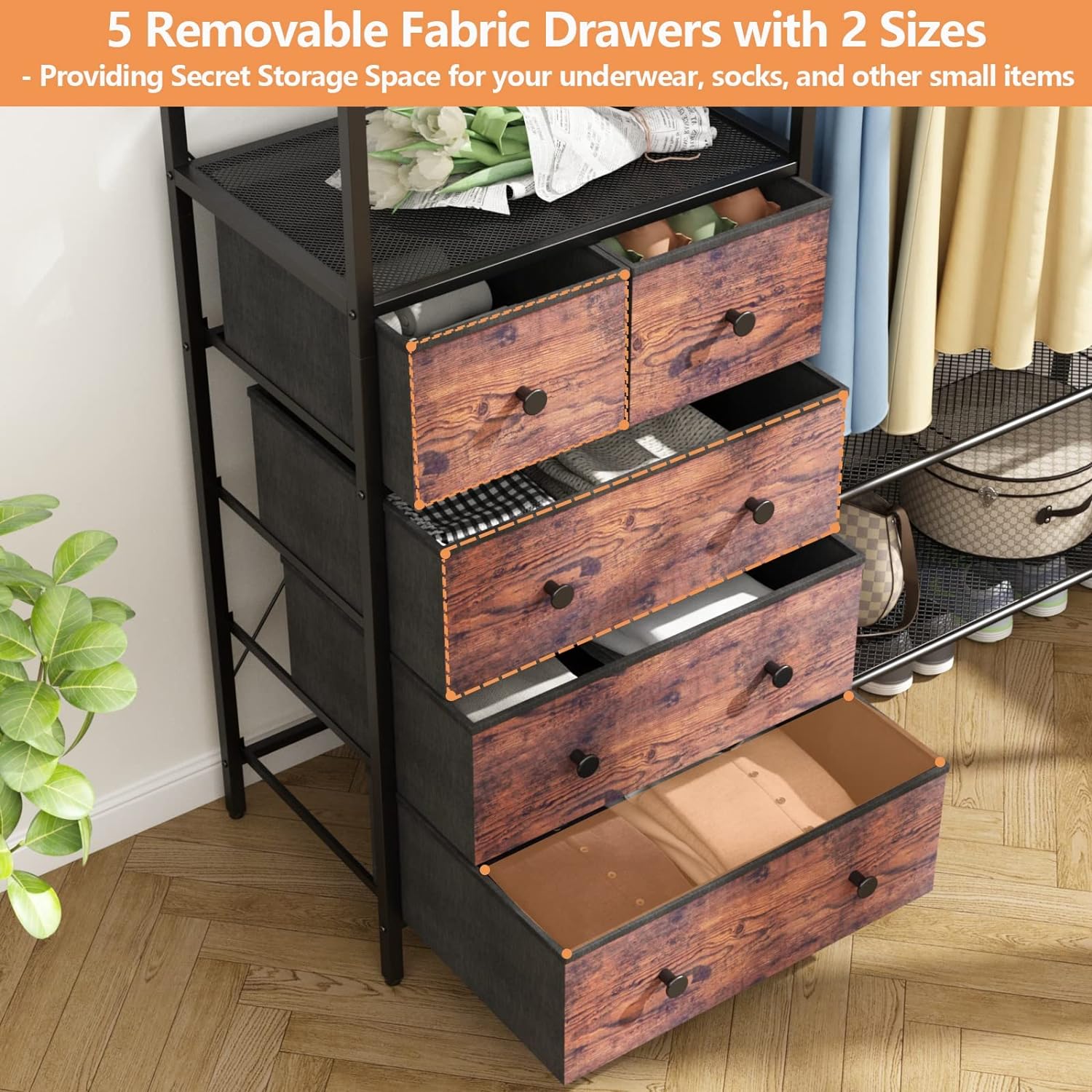 Heavy Duty Clothes Rack with 5 Drawers & 4 Storage Shelves, 70.9Hx59.1W Clothing Rack with 2 Hanging Rods, Wardrobe Closet Rack with 5 Hooks, Freestanding Garment Rack (Rustic Brown)