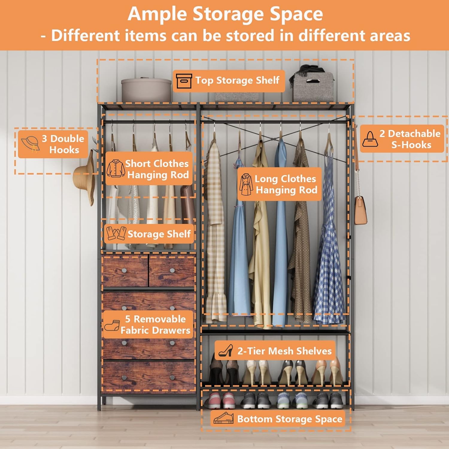 - šćAmple Storage SpacećTired of dealing with messy clothes? Take control of your wardrobe with this portable freestanding clothes rack that offers ample storage space for all your items. With 5 removable fabric drawers, 4 storage shelves, 2 hanging rods, and 5 hooks, this closet rack provides versatile storage options to meet your specific needs. Each area is thoughtfully designed to accommodate different items, making it easy for you to locate them without rummaging through clutter. Despite its generous storage capacity, this clothes rack occupies only a small portion of your room, maximizing your space efficiency.