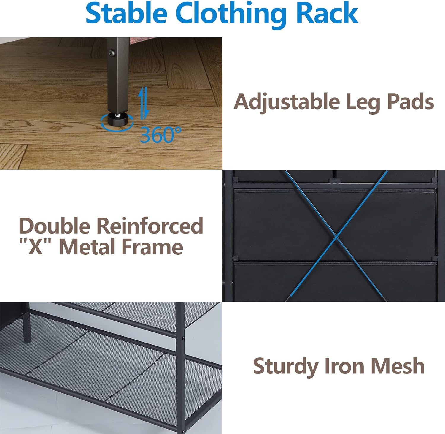 - šćSturdy and DurablećConcerned about the weight-bearing capacity of the rack? Rest assured that this heavy-duty metal closet storage organizer system is built to last. Crafted with a sturdy metal frame, high-quality MDF board, and high-grade non-woven fabric, it ensures durability and longevity. For enhanced stability, two X-shaped support rods are added at the back of the garment rack. Additionally, anti-tipping kits and adjustable non-slip footpads are included to further improve safety and prevent accidents.