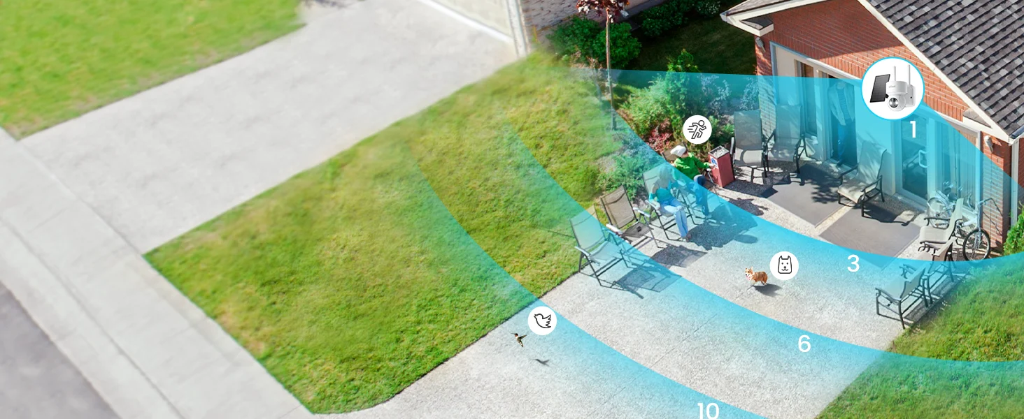 【PIR Motion Detection & Real-time Alerts】This solar security cameras wireless outdoor uses advanced AI algorithms, when the PIR motion detection sensor detects motion, you will not only receive an alert notification but the camera's floodlight and siren will also automatically activate, which can effectively warn intruders. Note: AI detection has additional features to distinguish between pets, packages, and cars (fees apply).