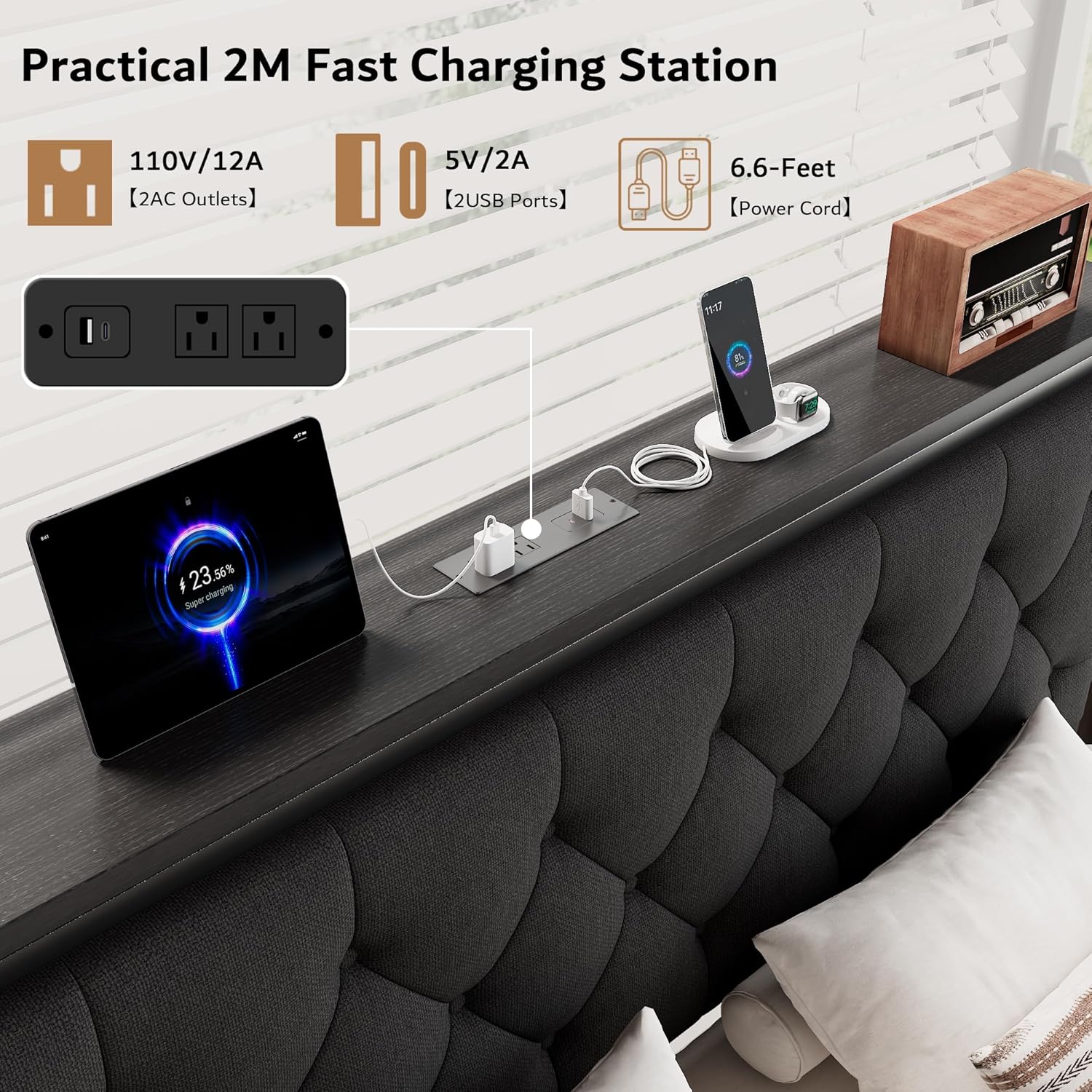 King Bed Frame with 2 Storage Drawers, Linen Upholstered Headboard Platform Bed with Charging Station, No Box Spring Needed, Metal Slats Support, Noise-Free, Easy Assembly, Black