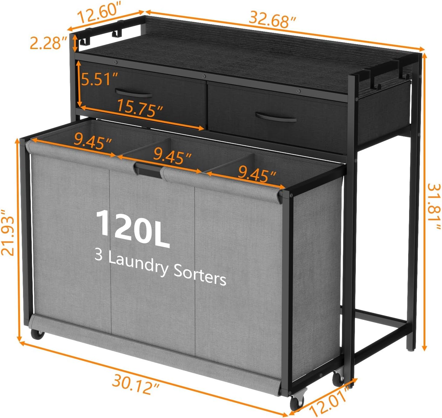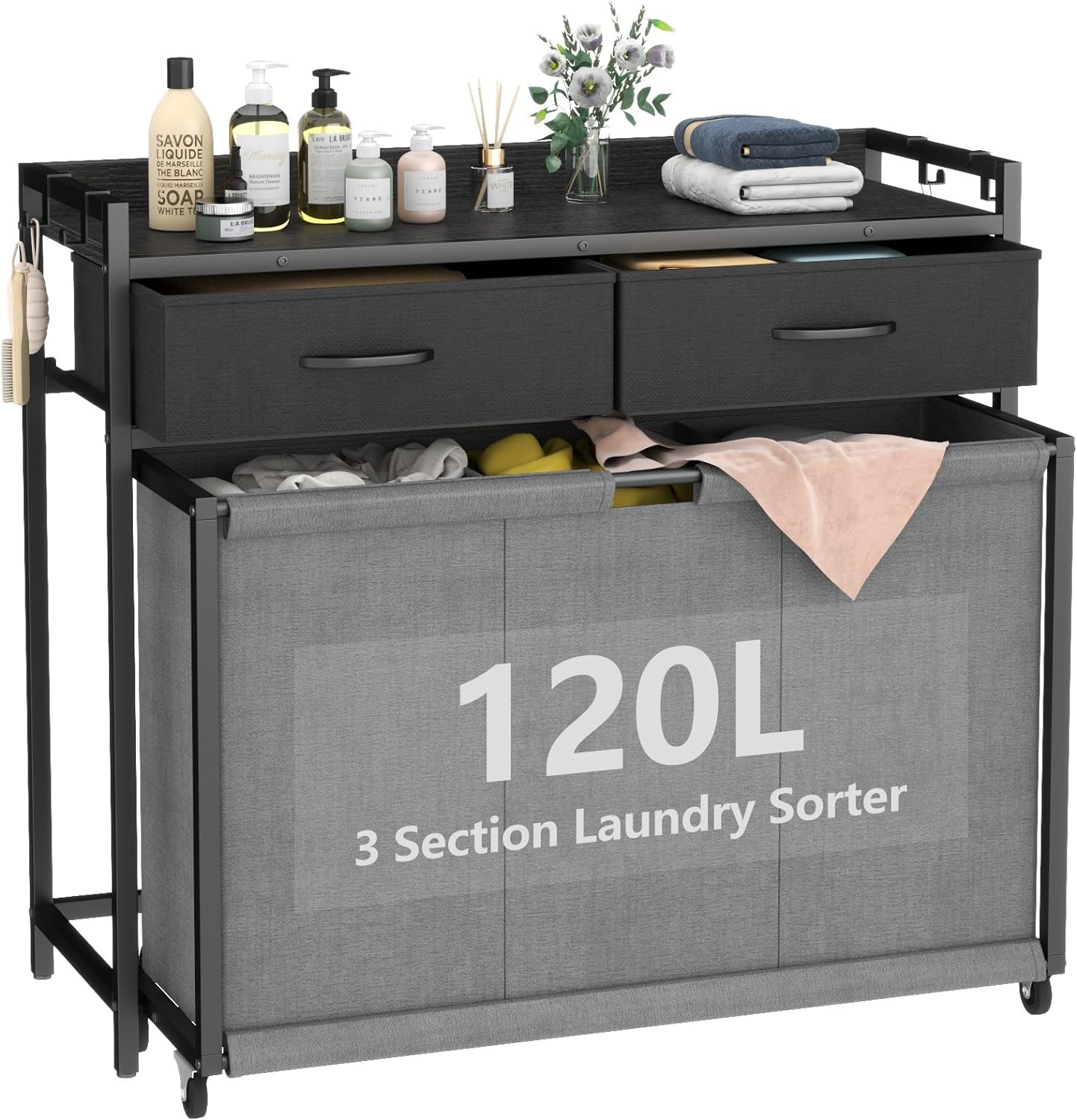 Laundry Hamper Laundry Basket with 3 Section Pull-Out Rolling Bags, Laundry Sorter for Organization and Storage with 2 Pull-Out Drawers for Laundry Room, Bathroom, Bedroom Use (Black)