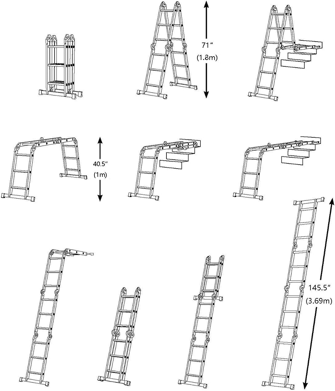 This is a multi-use ladder for home and business use, which can be transformed into 7 different formation to fit a huge variety of different works. It is easy to reassemble by locks and hinge for extra safety. Suitable to use in any place and your work will be more easier with this ladder!