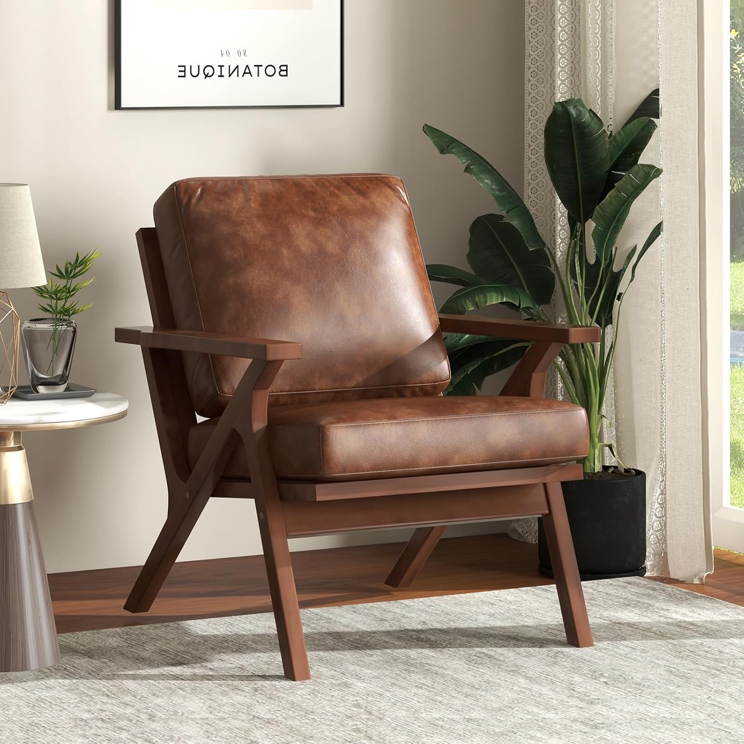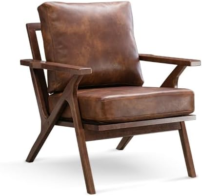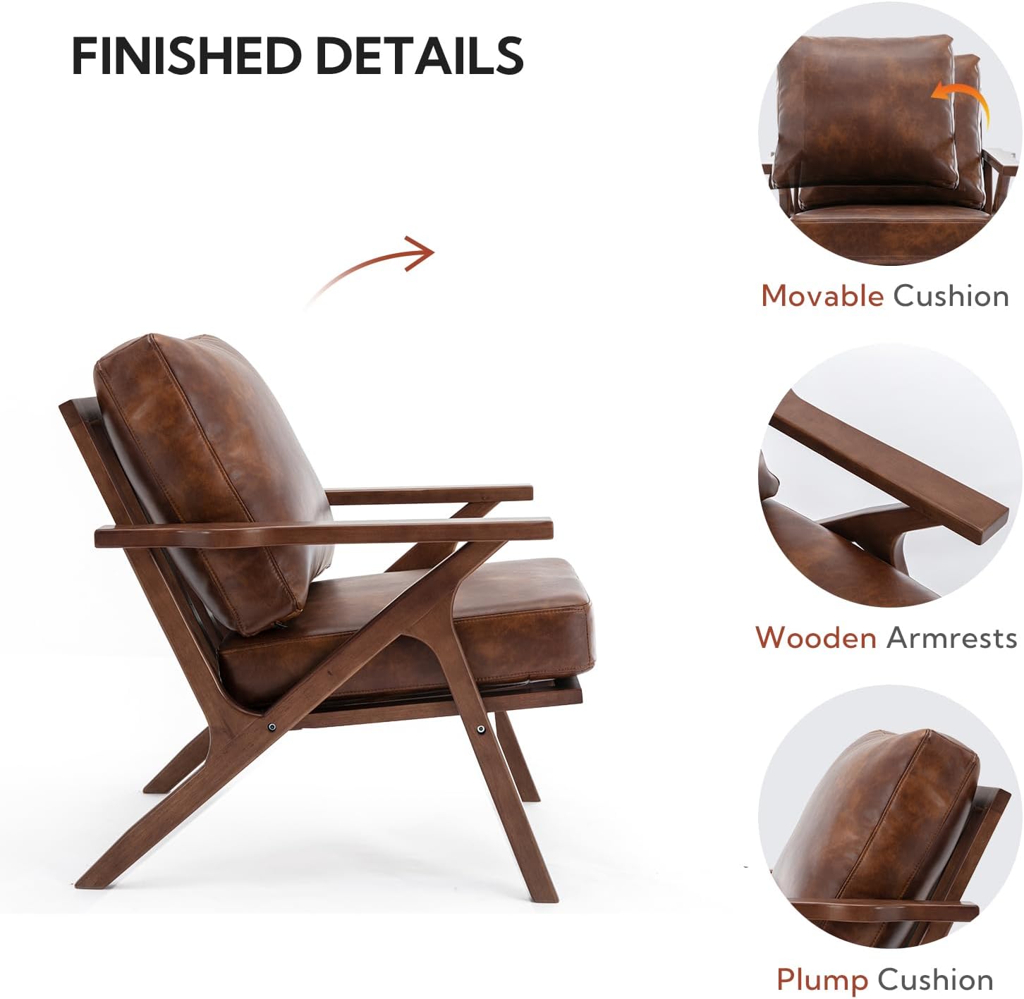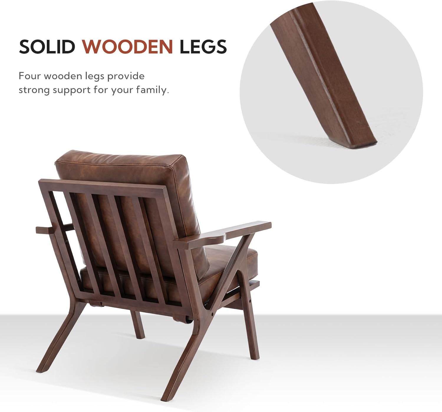 Mid-Century Modern Accent Chair for Living Room, Comfy Upholstered Faux Leather Armchair, Retro Leisure Reading Nook Chair with Wooden Frame, Brown