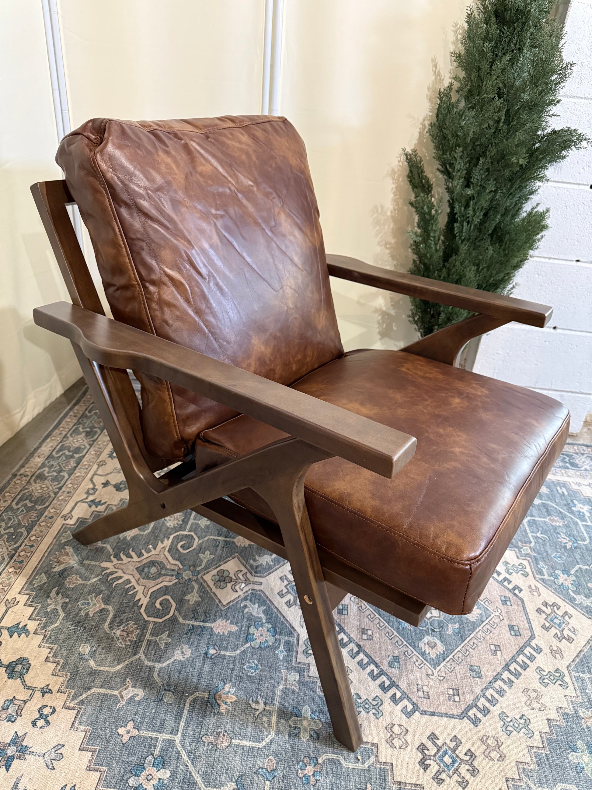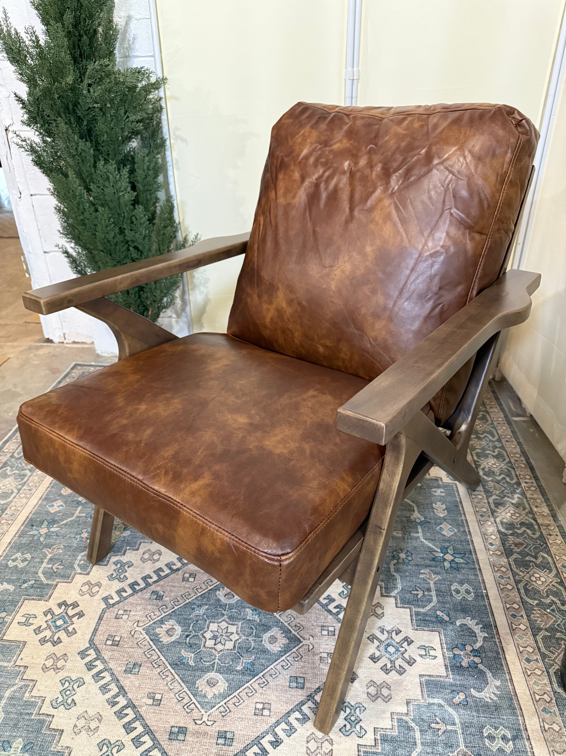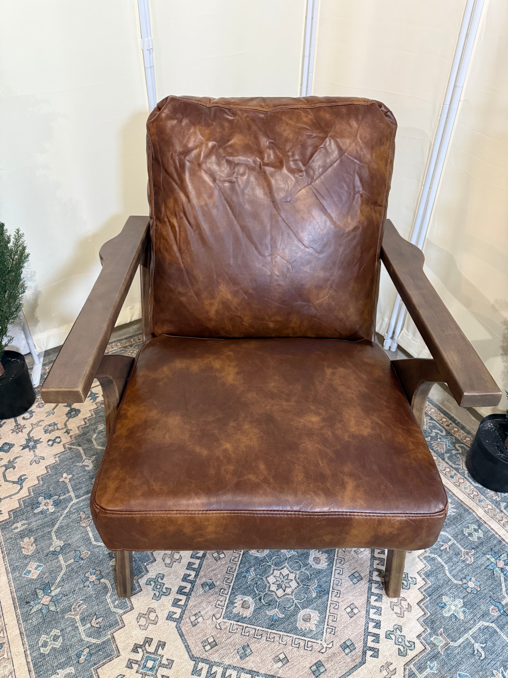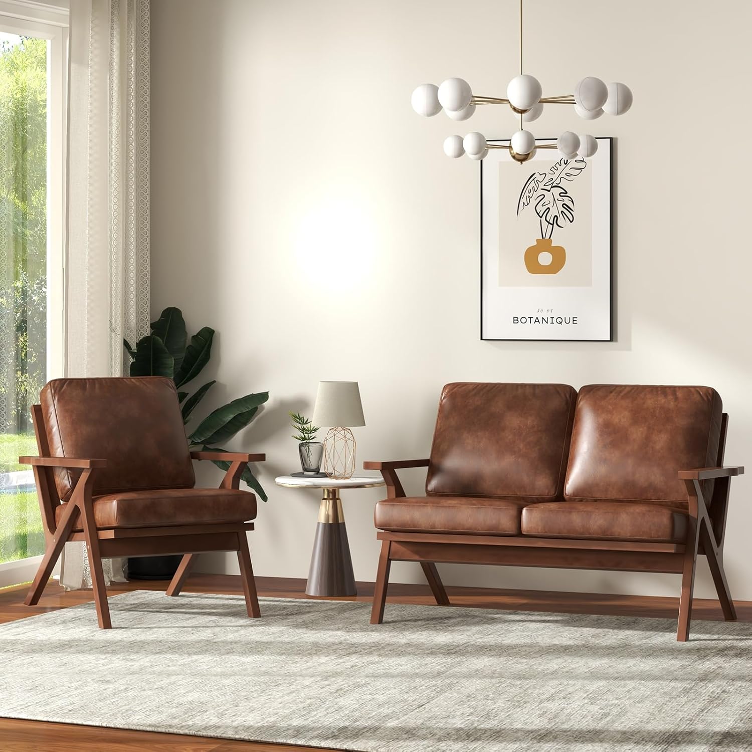 Mid-Century Modern Accent Chair for Living Room, Comfy Upholstered Faux Leather Armchair, Retro Leisure Reading Nook Chair with Wooden Frame, Brown