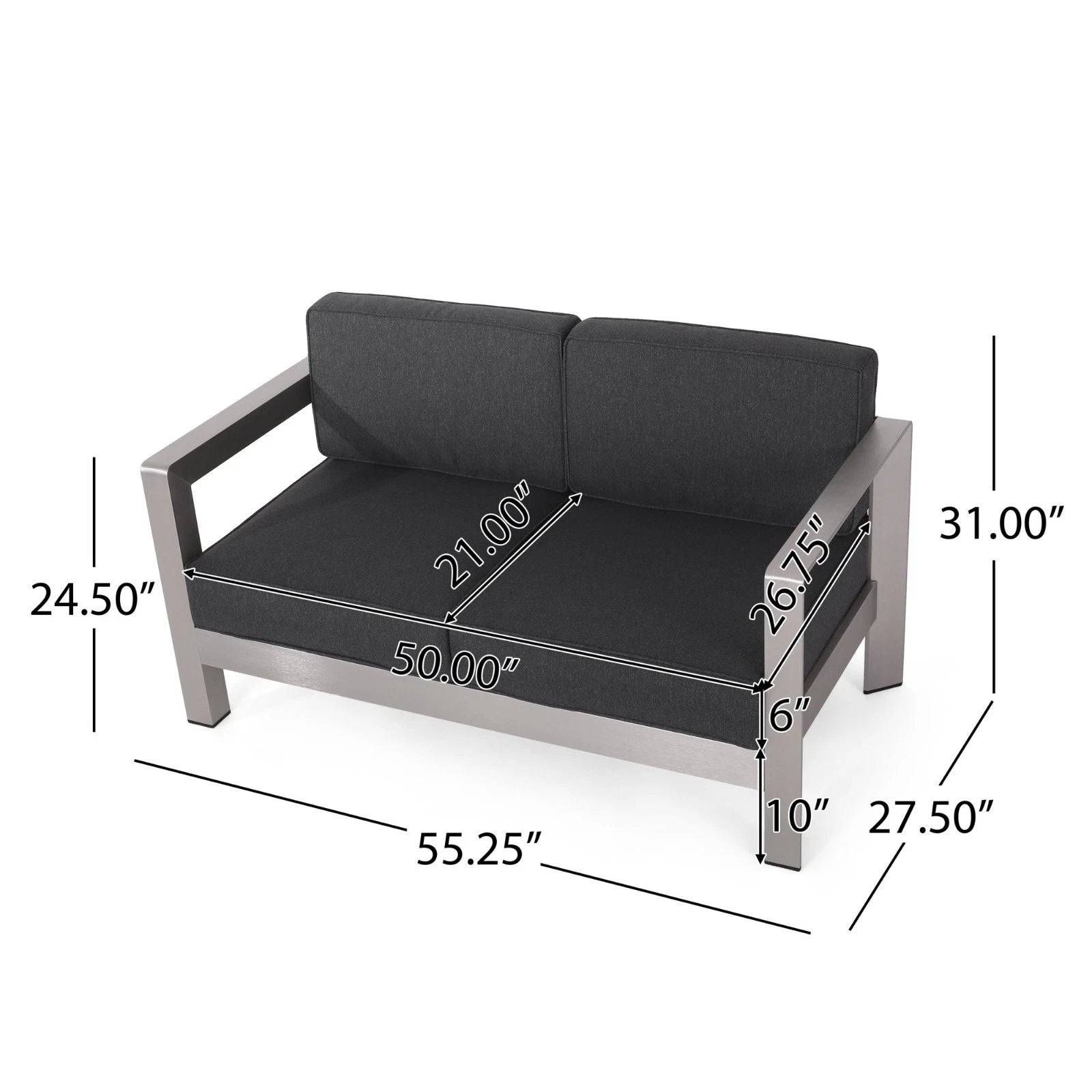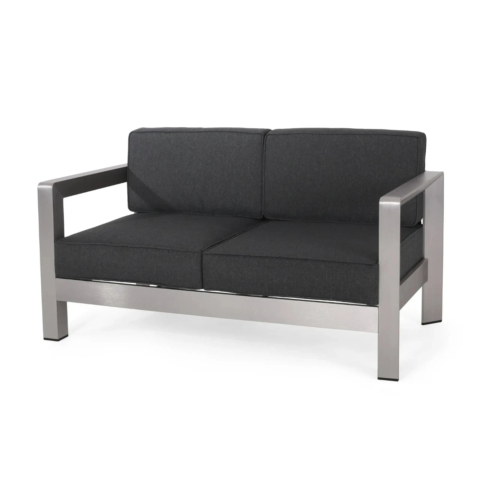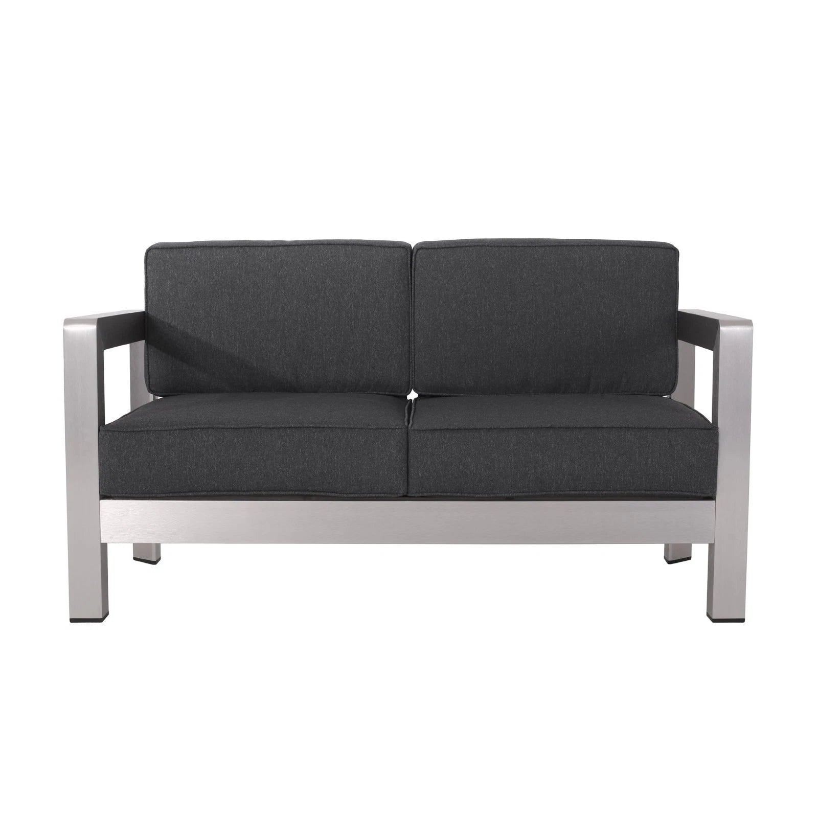 GDF Studio Alec Outdoor Aluminum Loveseat with Cushions, Silver, Charcoal: