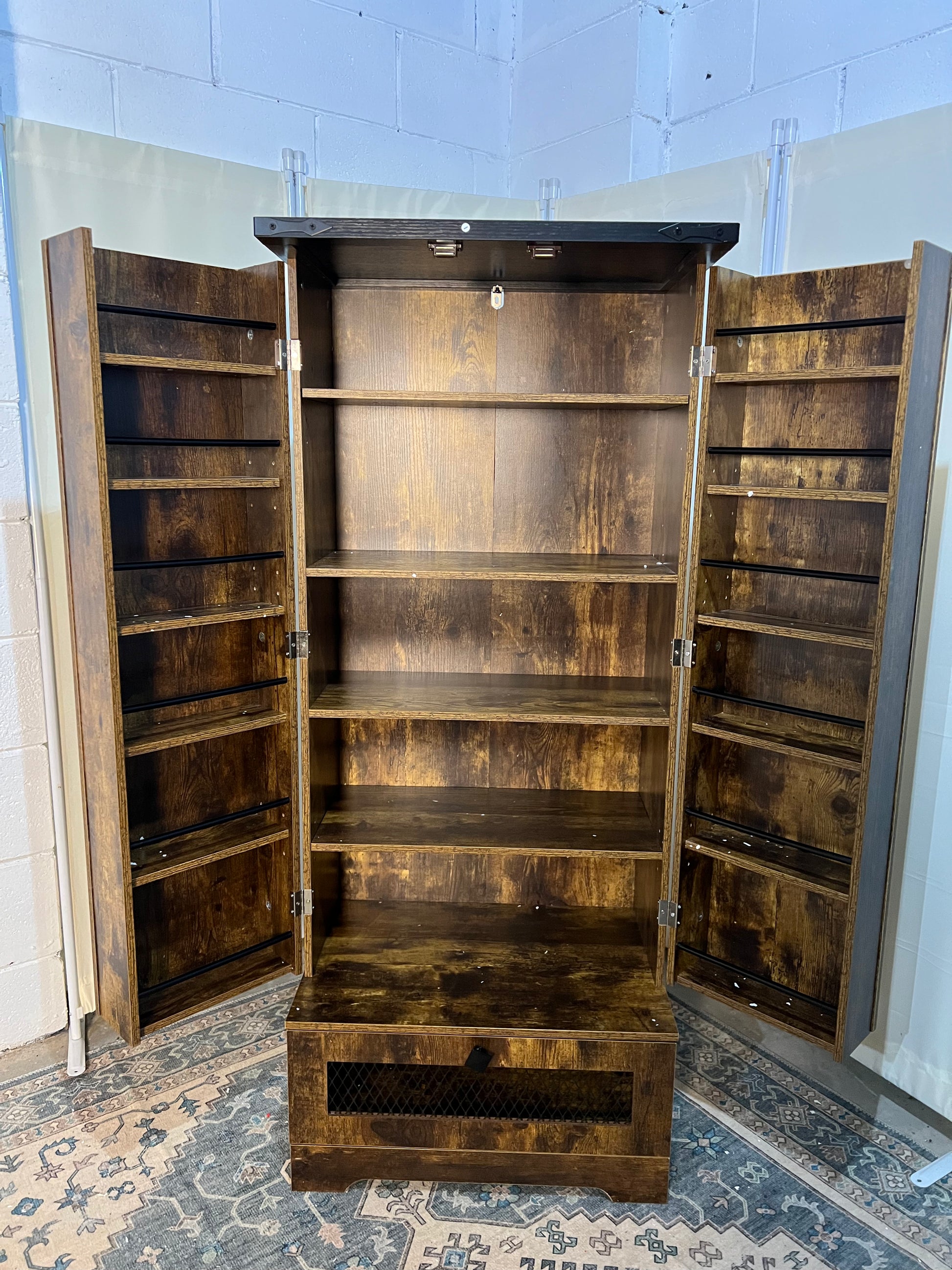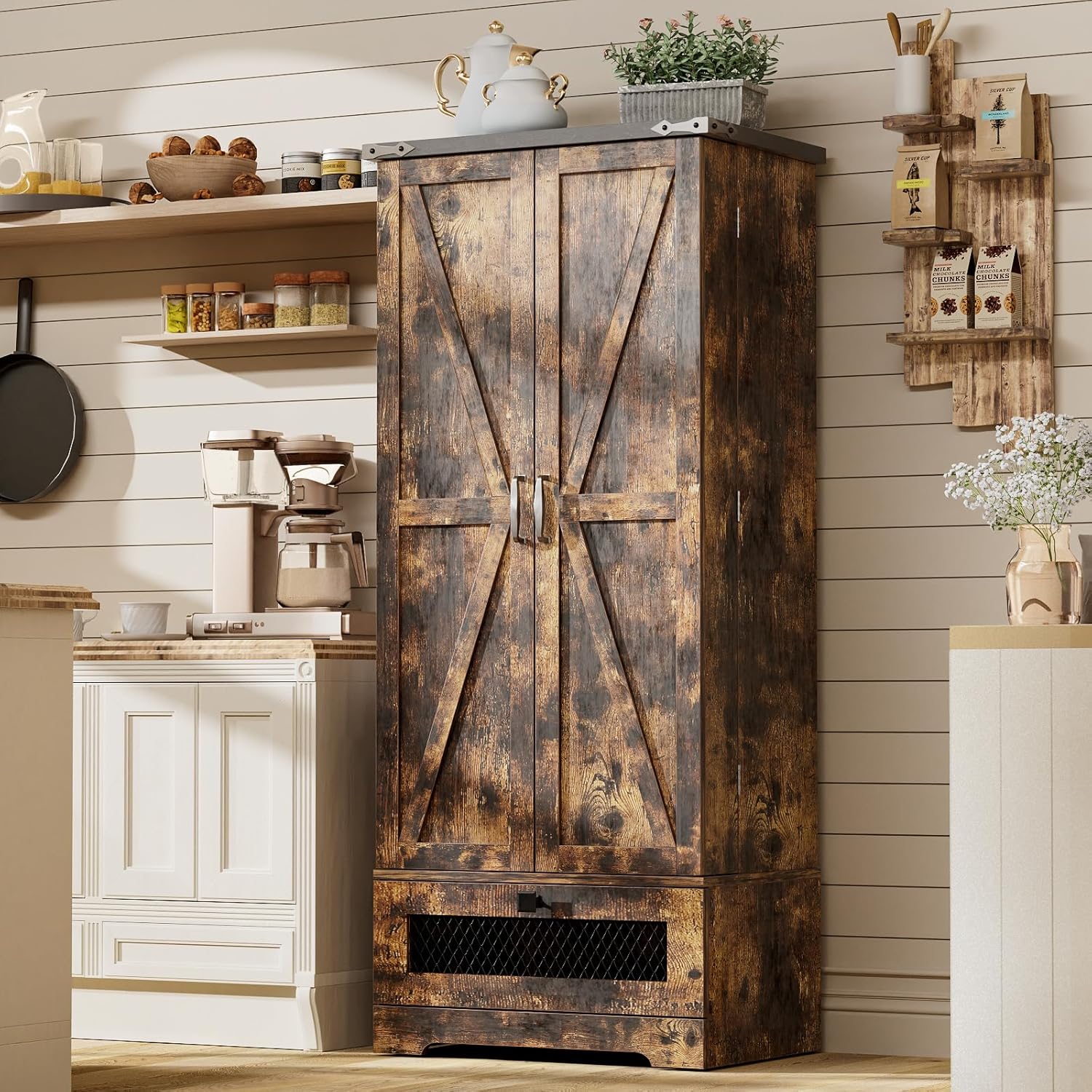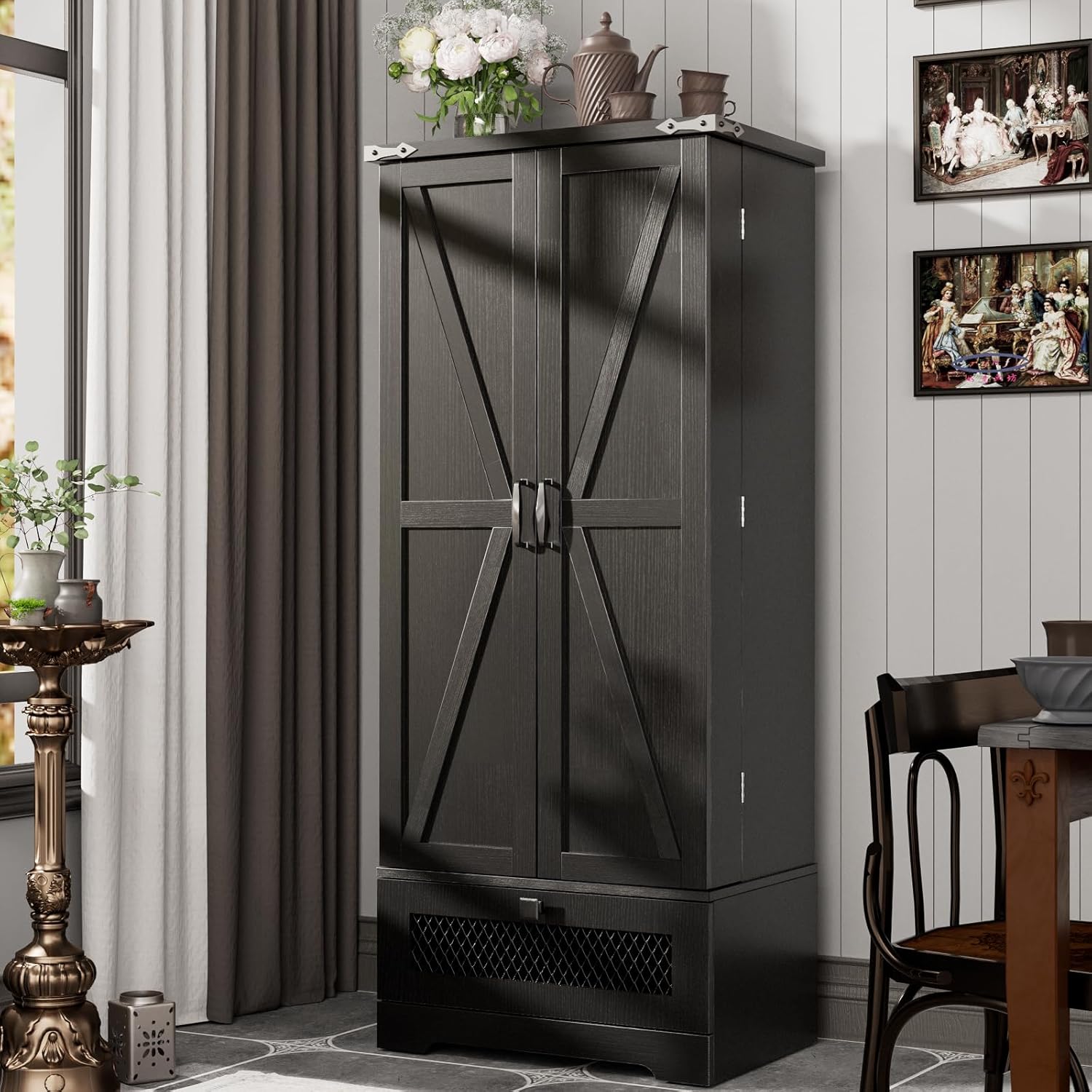 Sturdy Construction: Farmhouse pantry cabinet is crafted from laminated fiberboard, it features a clean-lined silhouette and a neutral solid finish for a versatile addition to any ensemble.