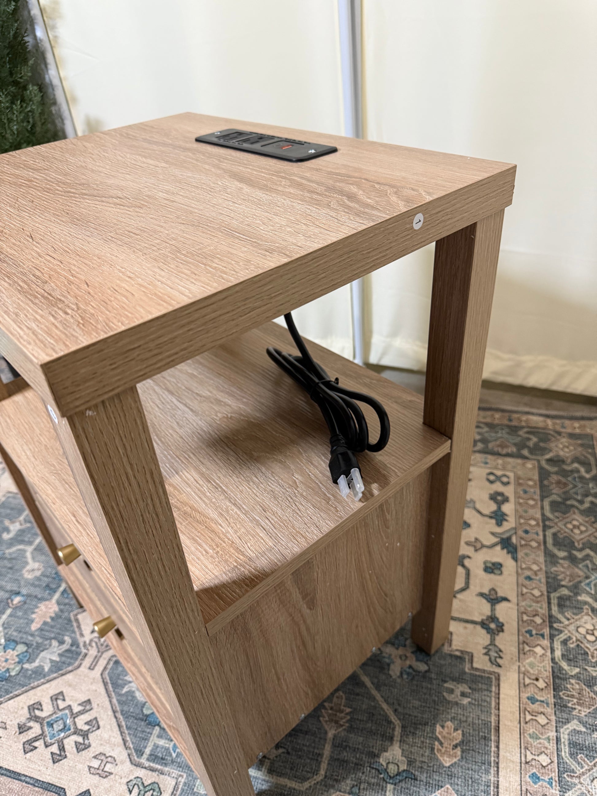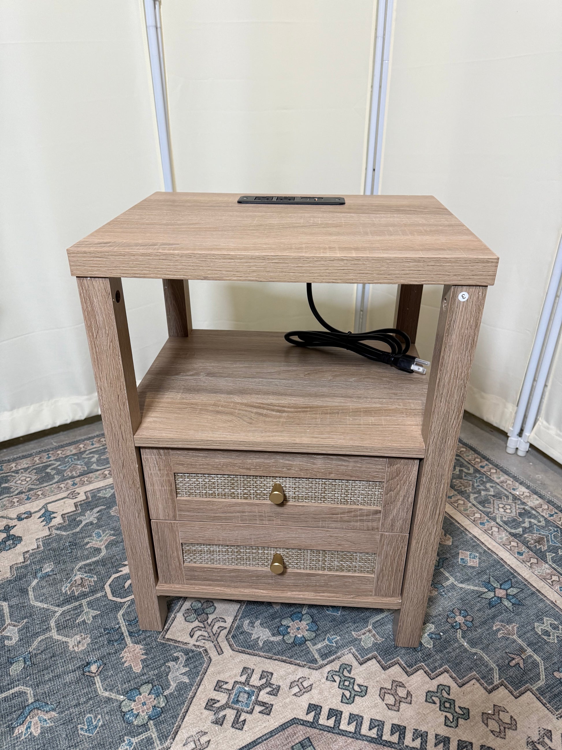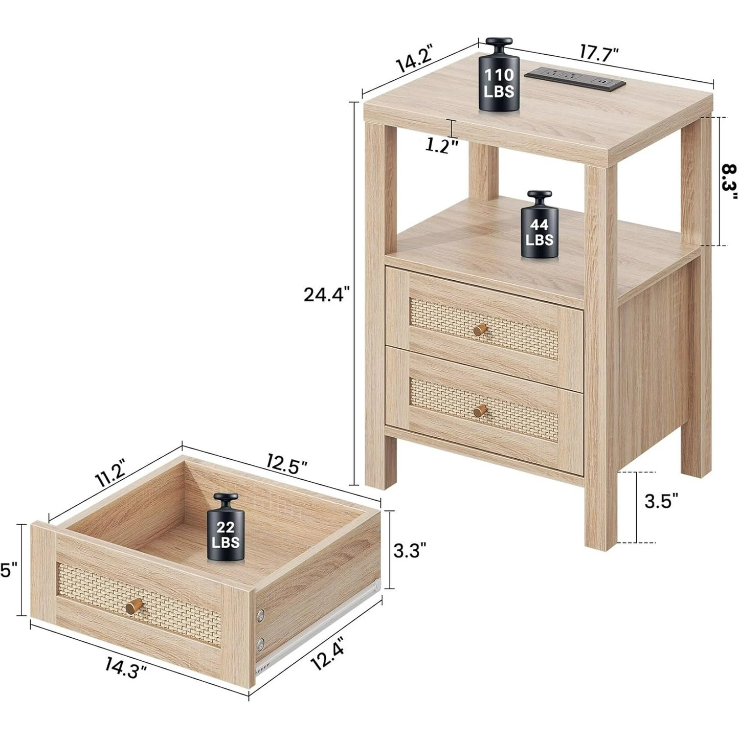 Introducing our stylish and functional Rattan Nightstand with Charging Station and Two Drawers, the perfect addition to any bedroom. The elegant design features ample storage space for your bedtime essentials, including two spacious drawers and a built-in charging station for your devices. The drawers are perfect for keeping your books, reading glasses, or other items close by while you sleep. Plus, with the built-in charging station, you can easily charge your devices overnight without having to worry about messy cords or tangled wires.This versatile bedside table is not only perfect as a bedside table in bedrooms but also serves as an ideal end table in living rooms.