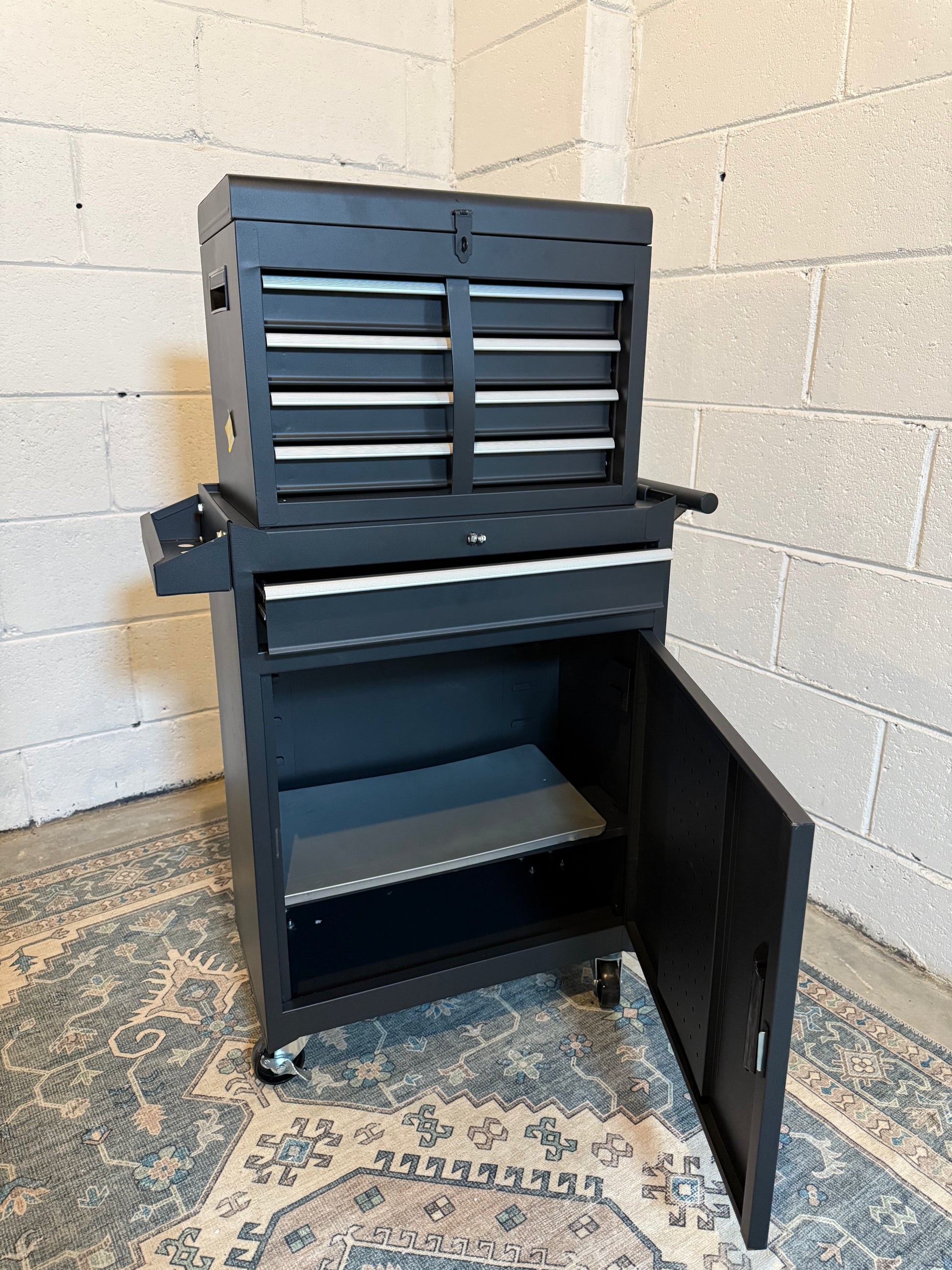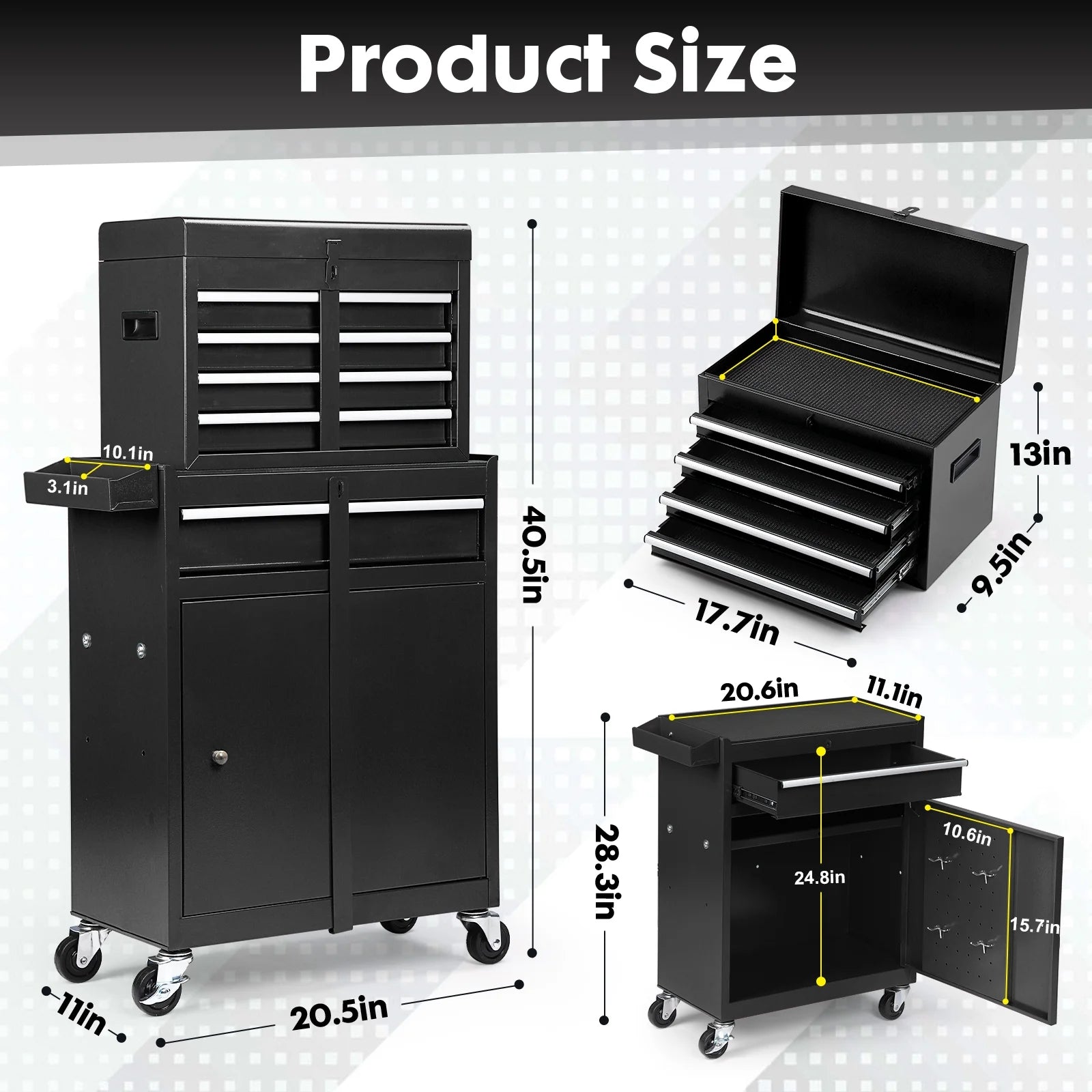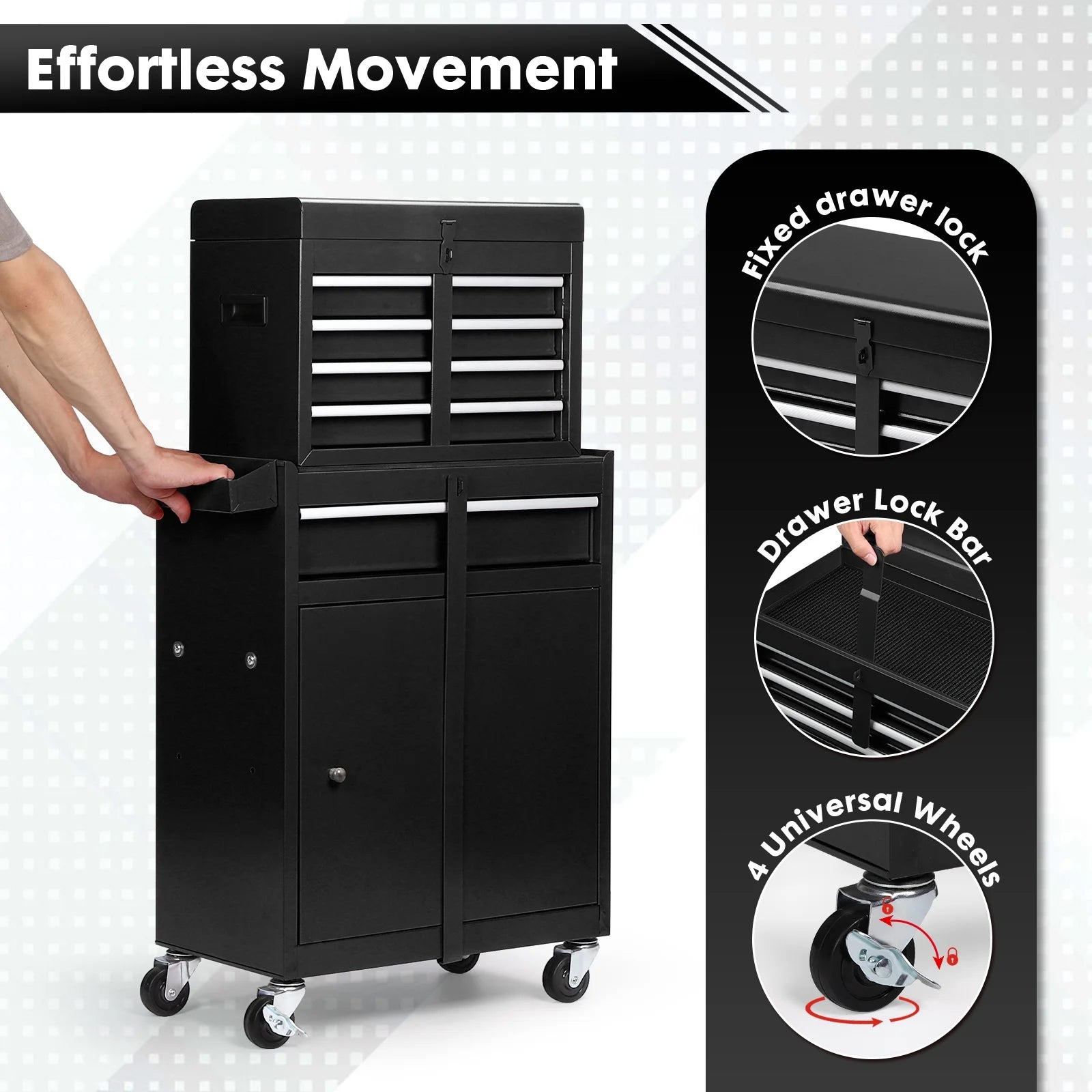 - 【2-In-1 Detachable Tool Box Design】This versatile tool cabinet can be separated into a 4-drawer tool box and a rolling cabinet, allowing you to use them together or individually. For added convenience, the top tool box can be stored inside the bottom cabinet, saving valuable space.【Heavy-Duty Construction】Built from cold-rolled steel, this tool chest offers impressive load-bearing capacity and exceptional durability for long-term use. The protective liner ensures your tools remain scratch-free and well-organized.【Ample Storage Capacity】Featuring a top tray, 5 drawers, a large bottom cabinet with an adjustable shelf, a side tool rack, and 4 removable hooks, this tool chest provides abundant storage for various tools like screwdrivers, spanners, and boxes, tailored to your specific needs.【Secure Locking System】Two locking bars secure all drawers, the tool tray, and the bottom cabinet, with an additional locking buckle for enhanced security. The protective liners in the top tray and drawers help prevent scratches and protect your tools.【Universal & Lockable Wheels】The rolling tool chest is equipped with a pull handle and 4 universal wheels for effortless mobility. One lockable wheel ensures the chest stays firmly in place, making it ideal for use in garages, workshops, warehouses, repair shops, and more.