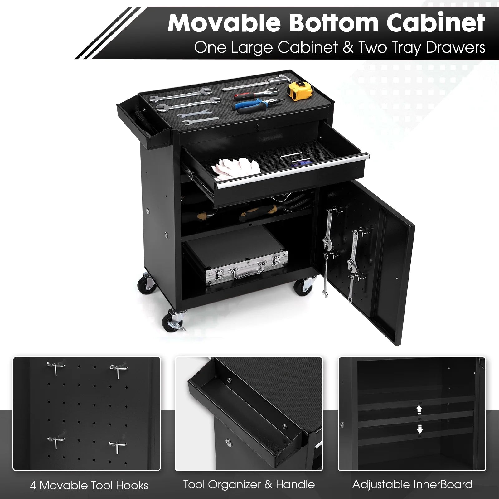 - 【Secure Locking System】Two locking bars secure all drawers, the tool tray, and the bottom cabinet, with an additional locking buckle for enhanced security. The protective liners in the top tray and drawers help prevent scratches and protect your tools.