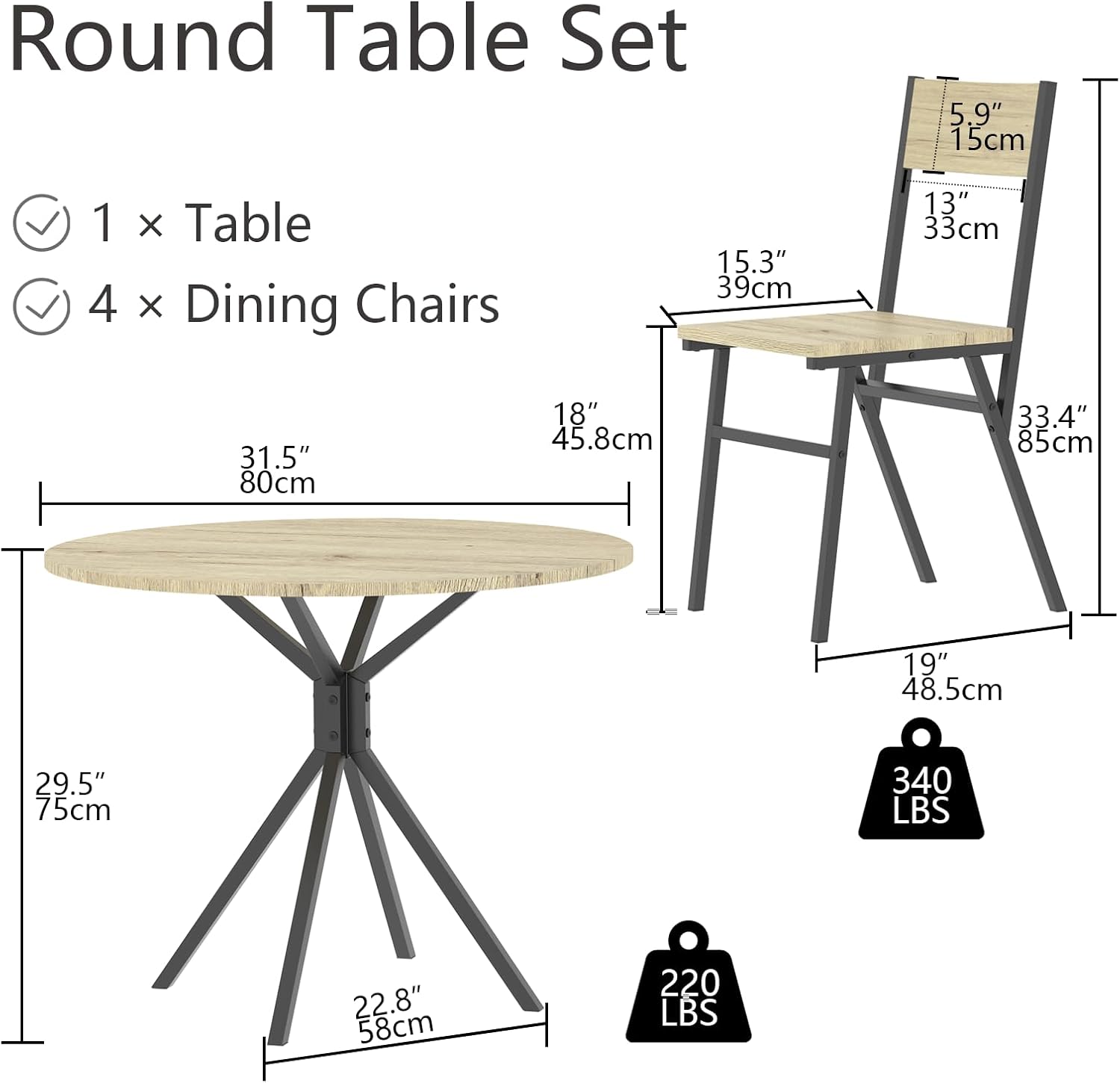 Round Dining Table Set for 4, 31.5" Small Round Kitchen Table with 4 Chairs, 5 Piece Dining Room Table Set with Steel Legs, Space-Saving Dinner Table, Coffee Table for Small Space