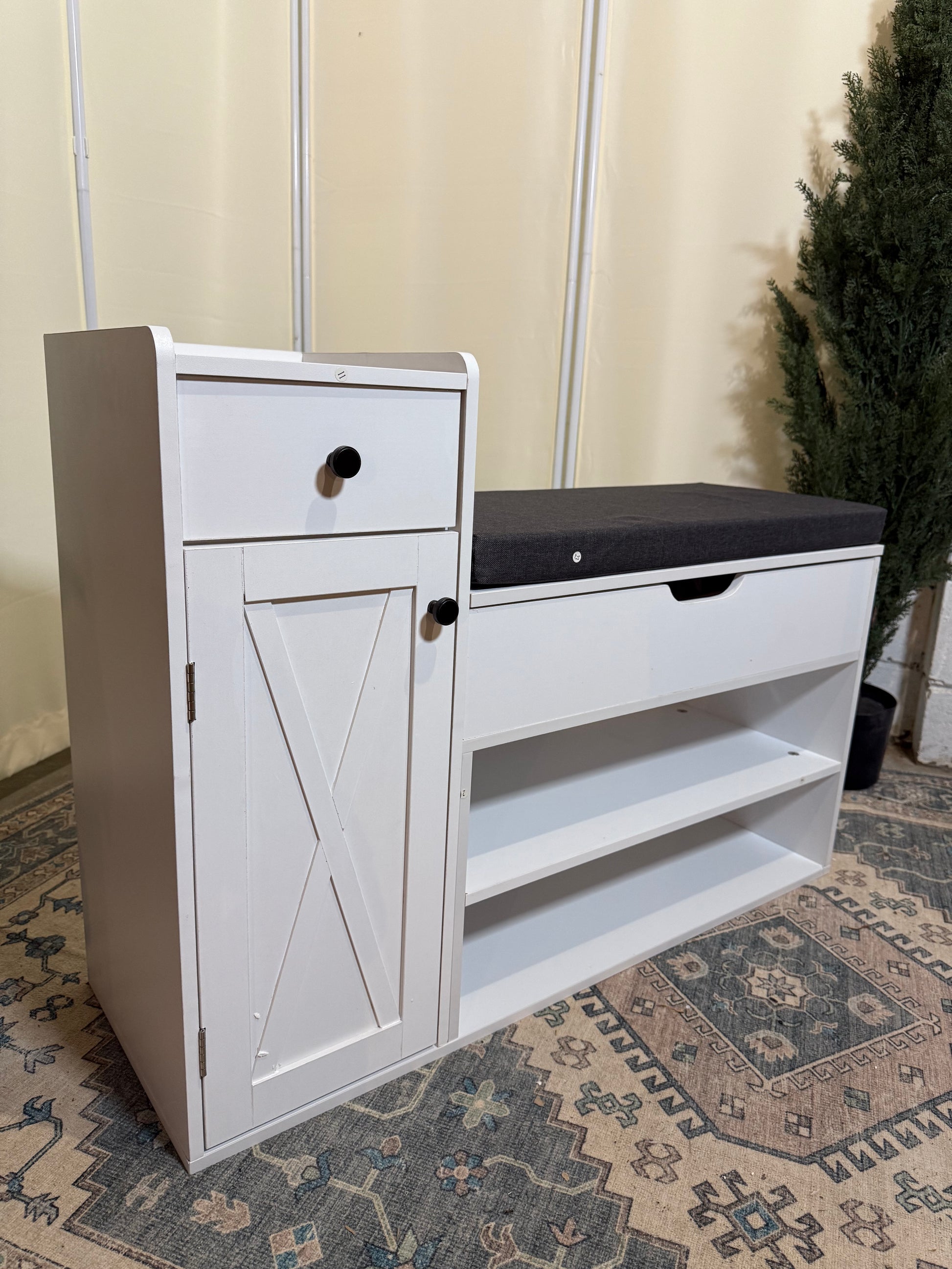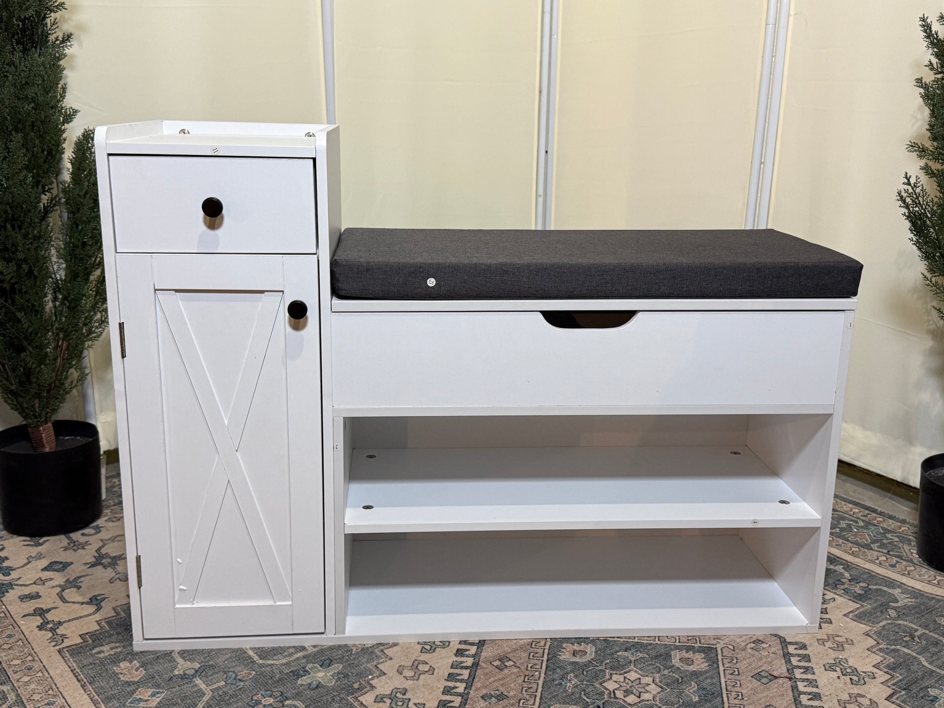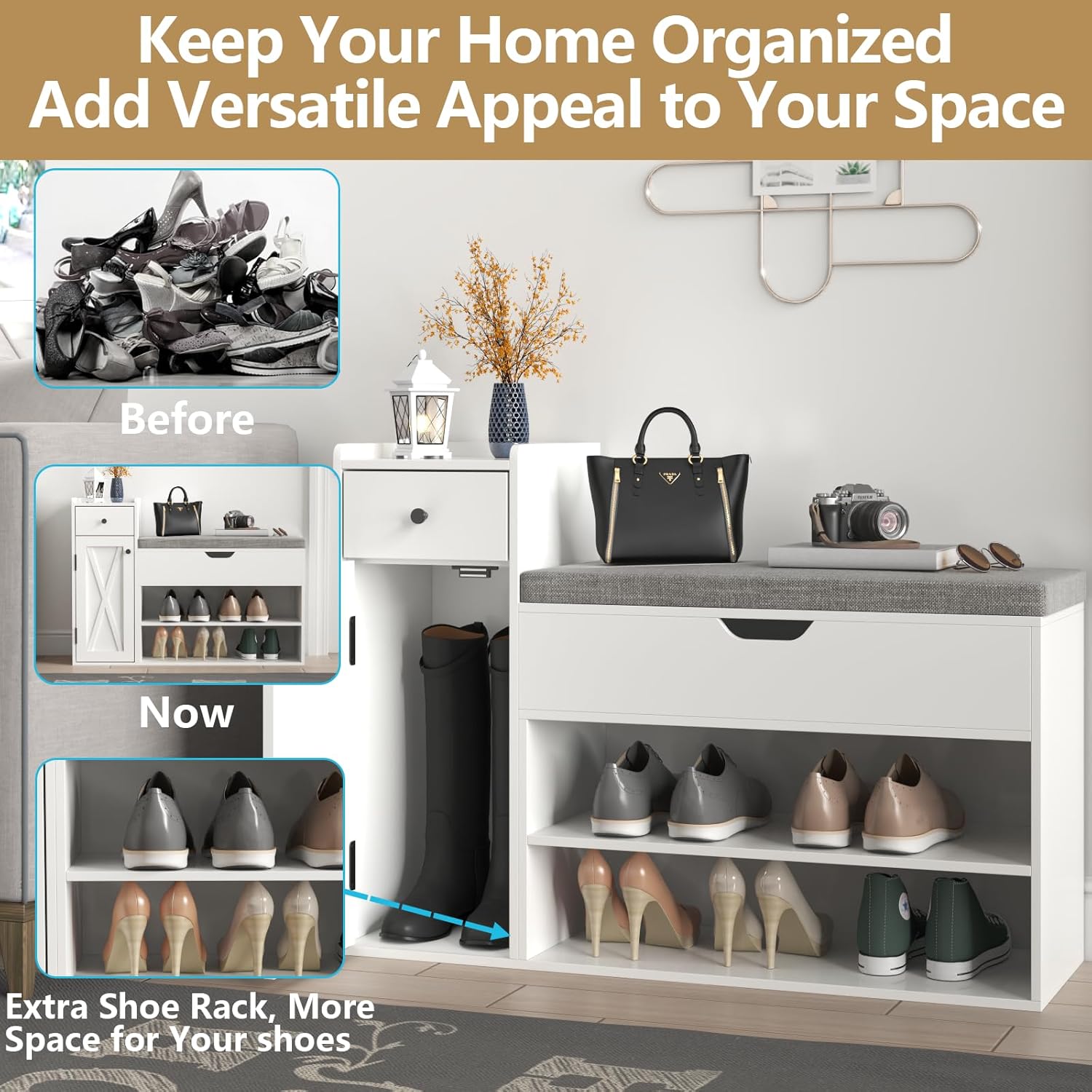 Shoe Storage Bench, 2-Tier Farmhouse Entryway Bench with Lift Top Storage Box, Drawer & Soft Removable Seat Cushion, Silm Shoe Rack with Shoe Cabinet for Entryway, Hallway, Bedroom, White