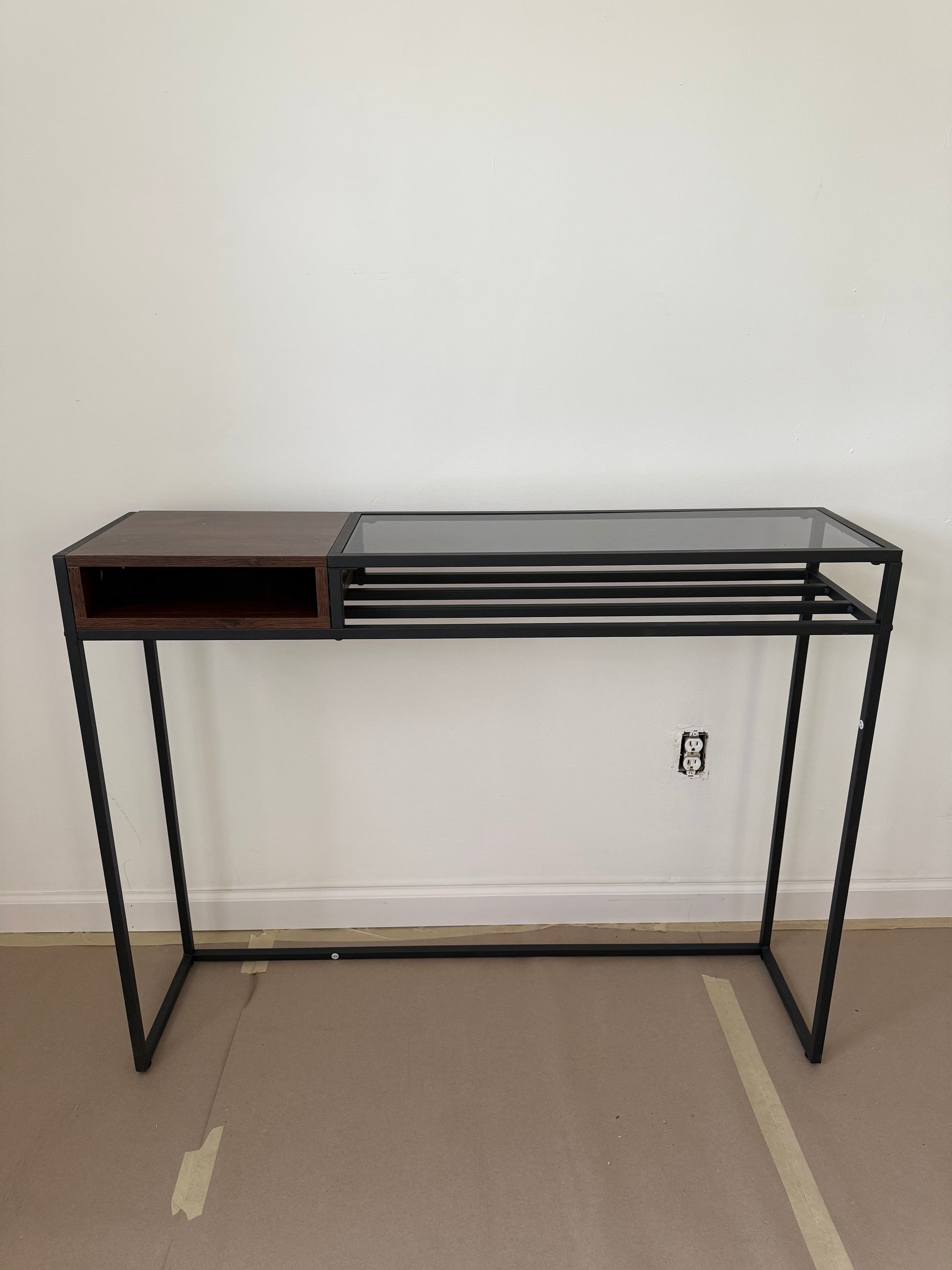 - Modern Design: The Timeless Entryway Console table is the perfect blend of contemporary and modern design. With an open wooden drawer, sleek metal frame, and clear glass tabletop this narrow table is perfect in any room.
