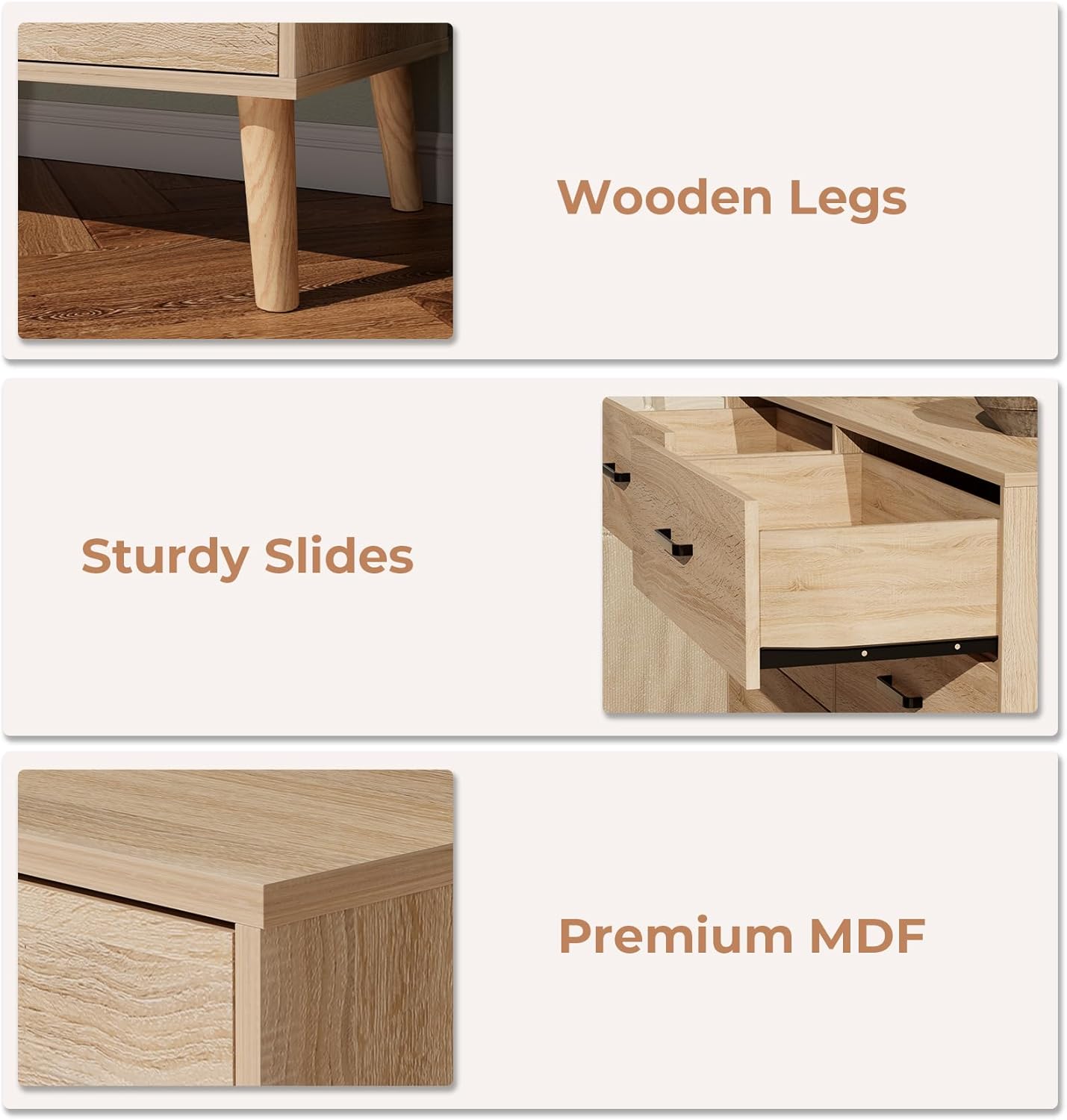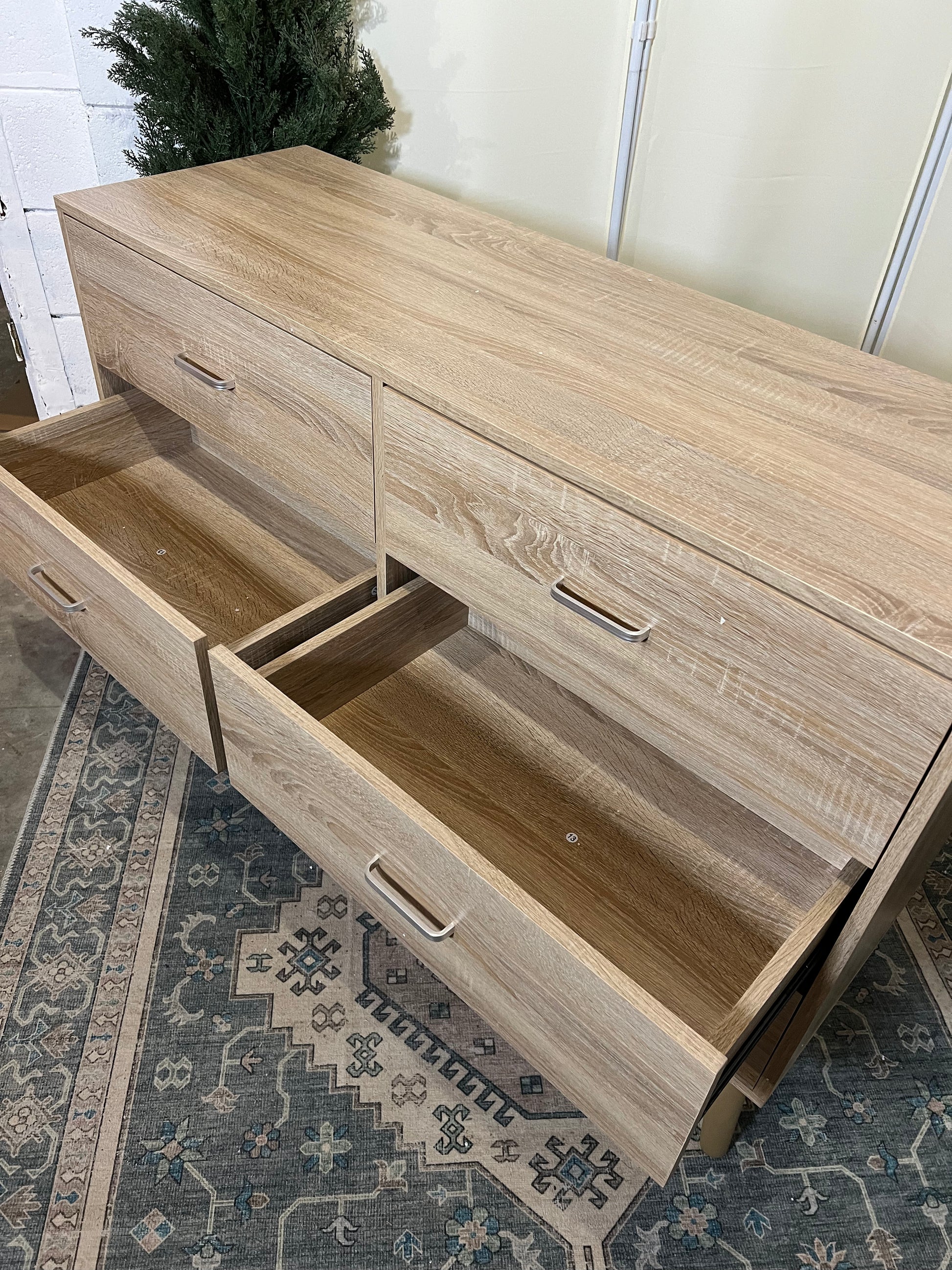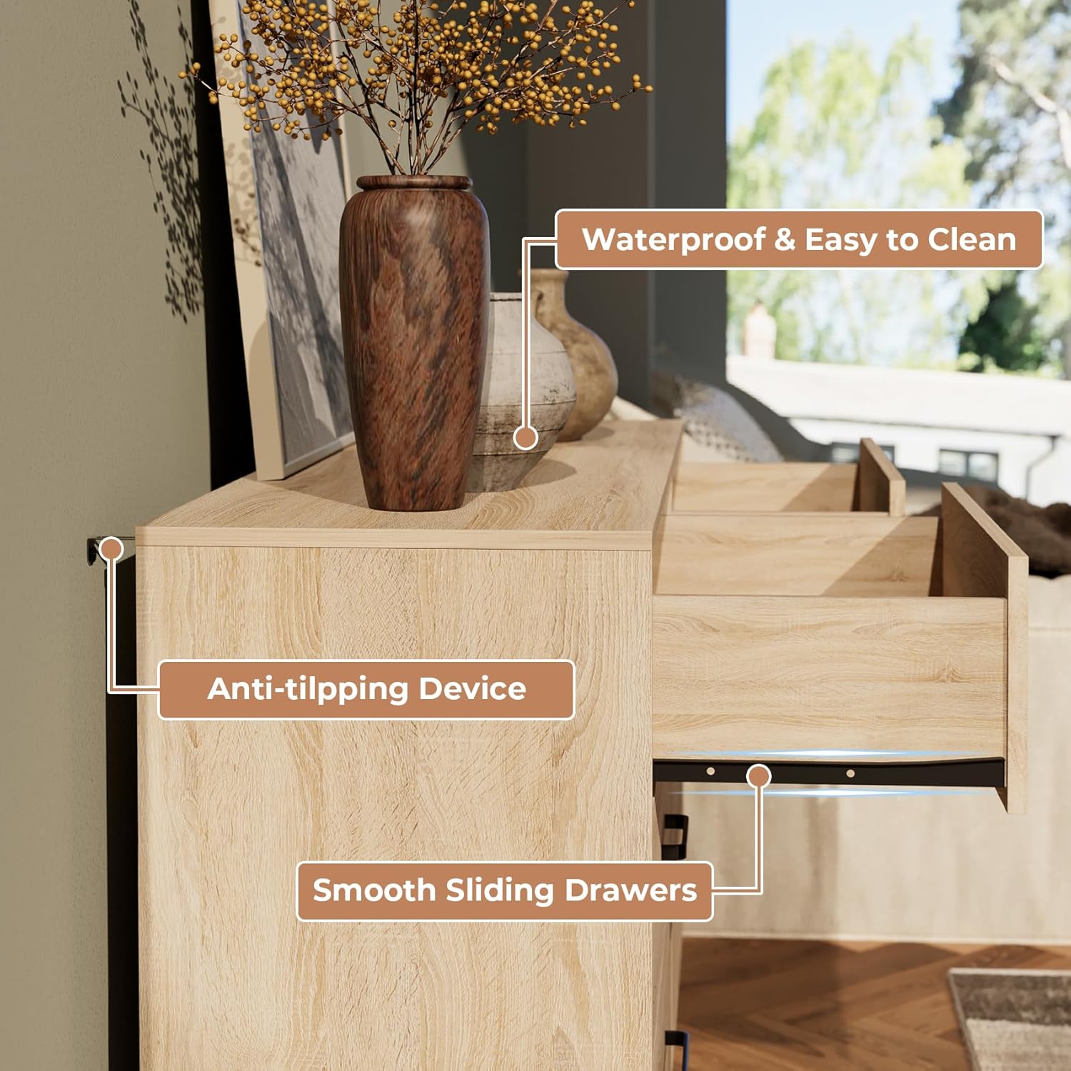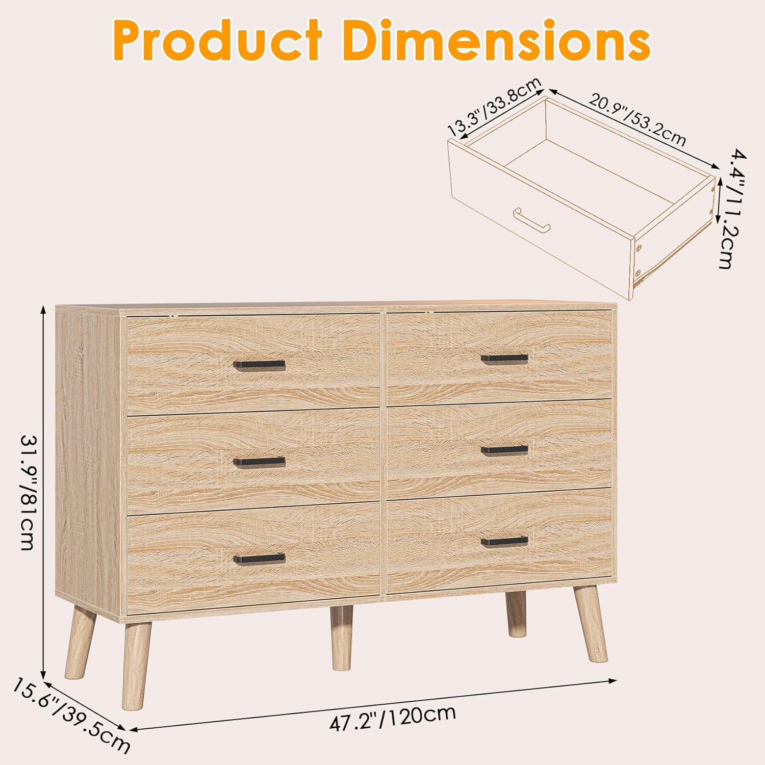 Wood Dresser for Bedroom, 6 Drawer Dresser with Metal Handles, Mid Century Modern Dresser Double Chest of Drawer (Light Oak)